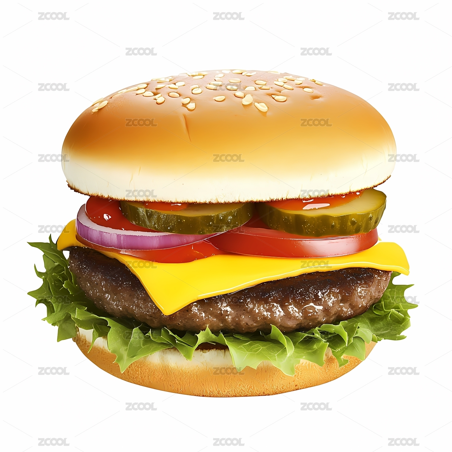 一个芝麻汉堡里面有奶酪西红柿和生菜