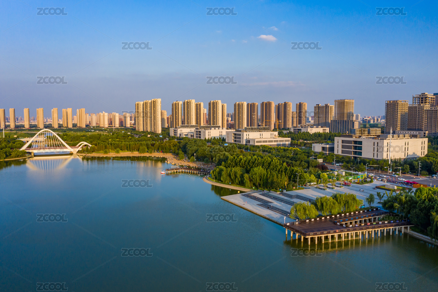 航拍郑州高新区天健湖公园城市湿地湖泊水系