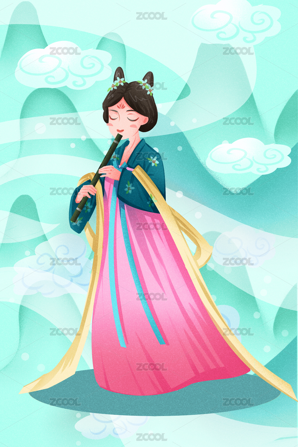 古装女性在大自然中吹萧 中国风国际音乐日插画