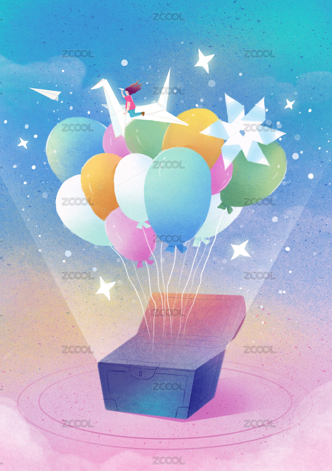 宝箱里飘出的气球风车和千纸鹤上玩纸飞机的