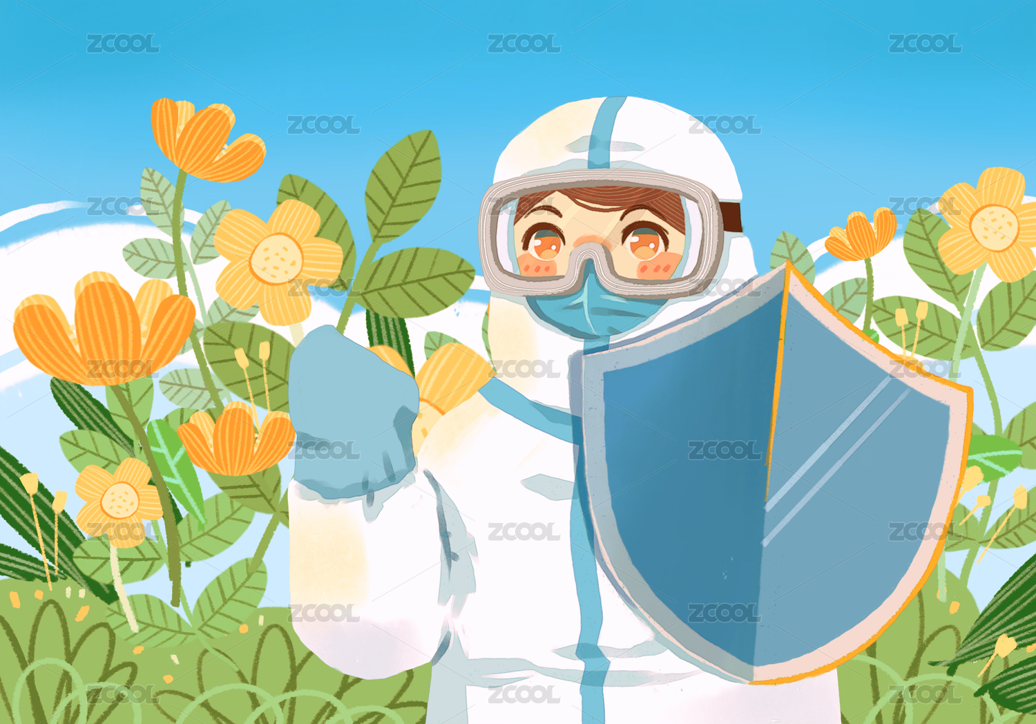 插画花丛中的抗疫战士