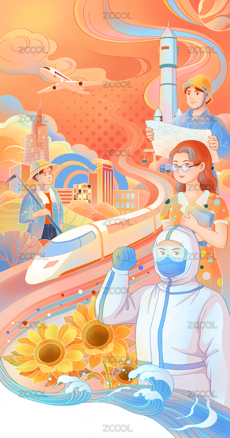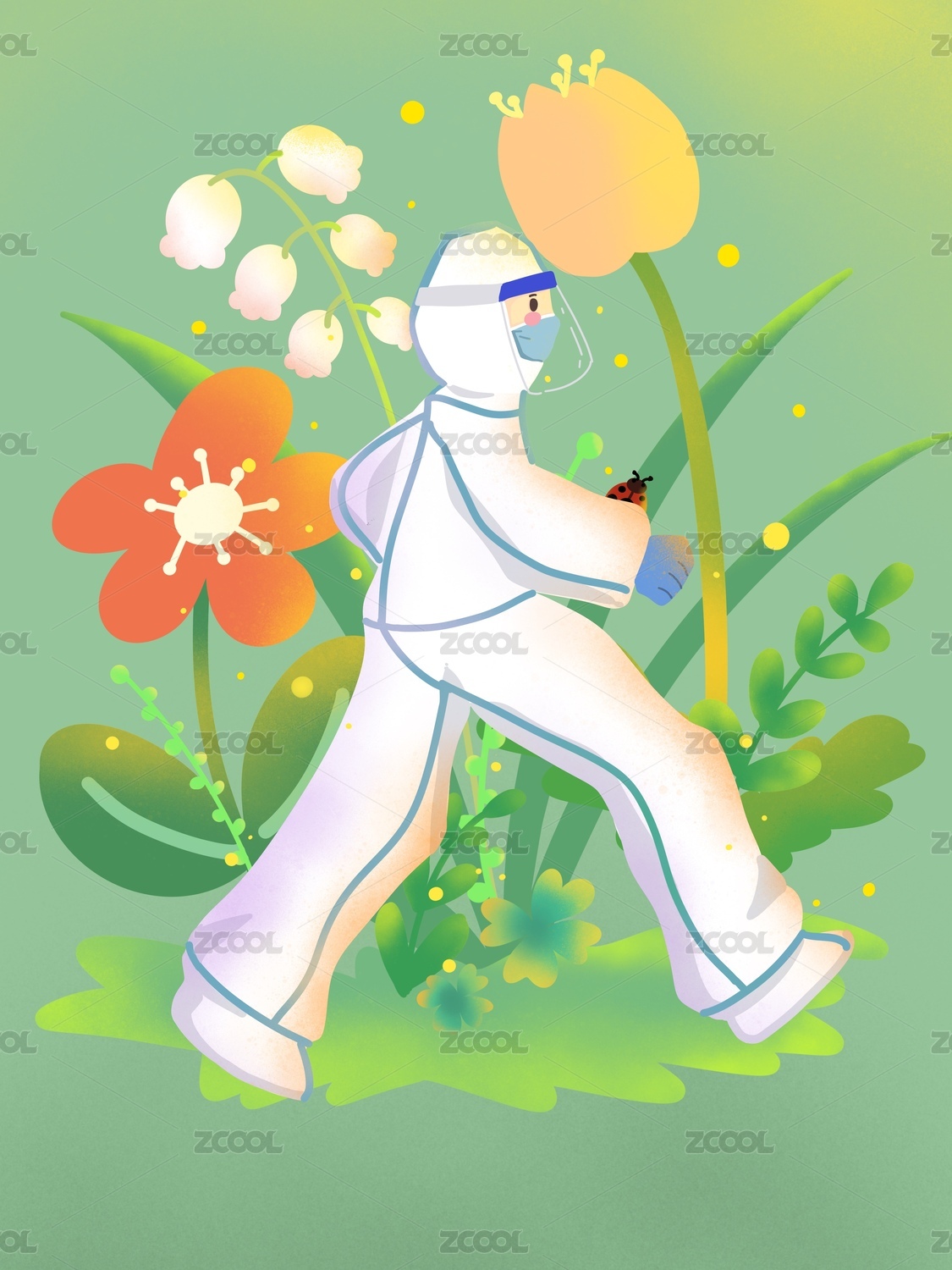 插画花丛中的抗疫战士