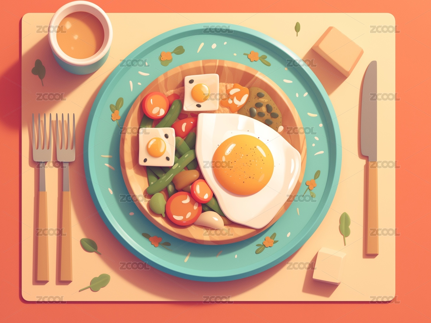 健康早餐美食沙拉俯视图健身餐鸡蛋面包插画