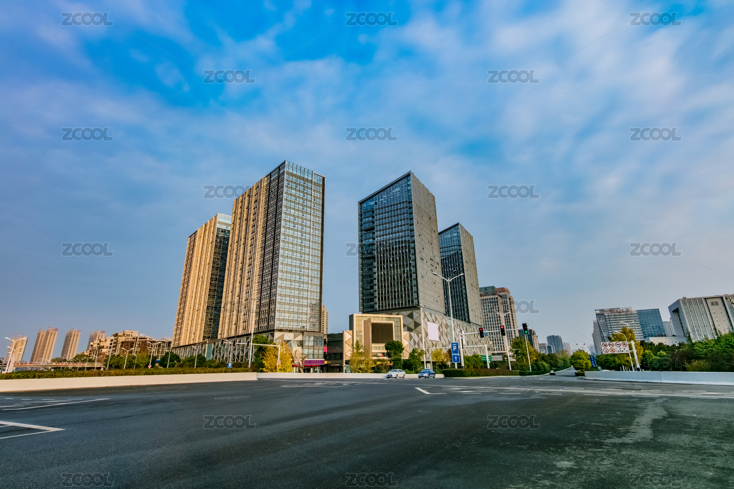 中国四川成都天府大道沥青路面与路边的现代建筑