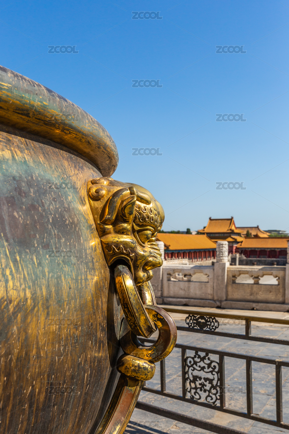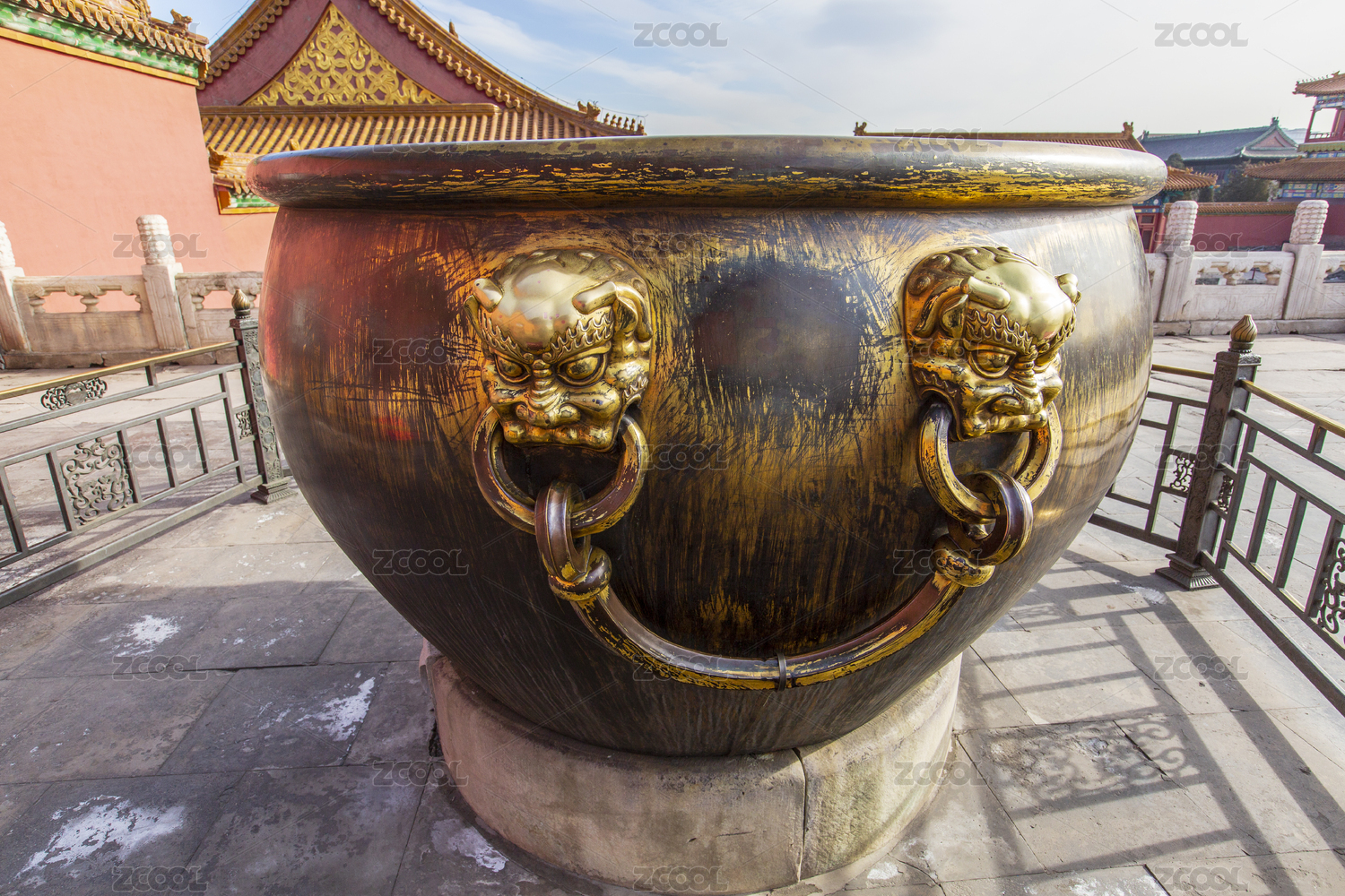 中国北京故宫院中的带狮子头像的铜制大缸