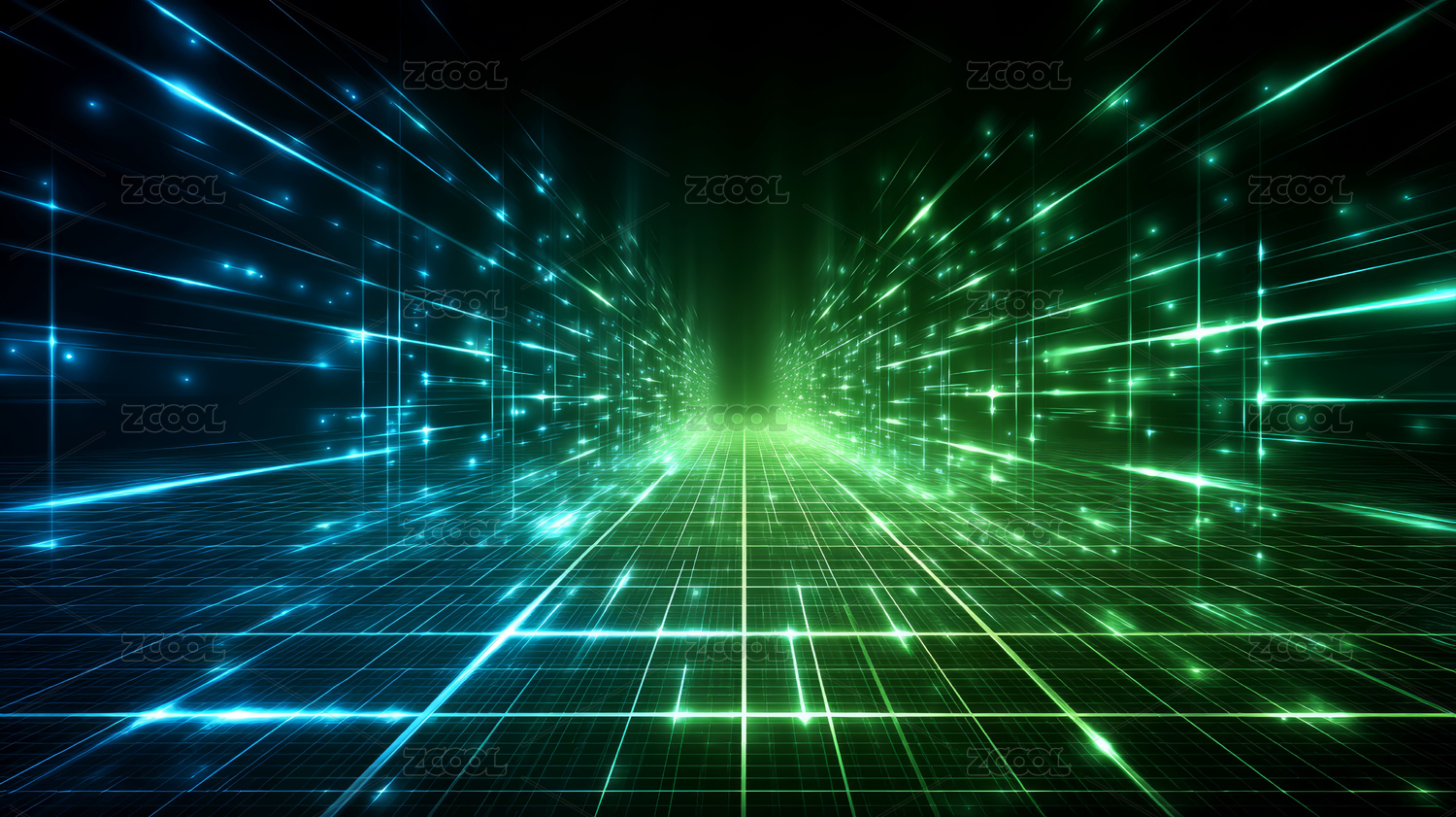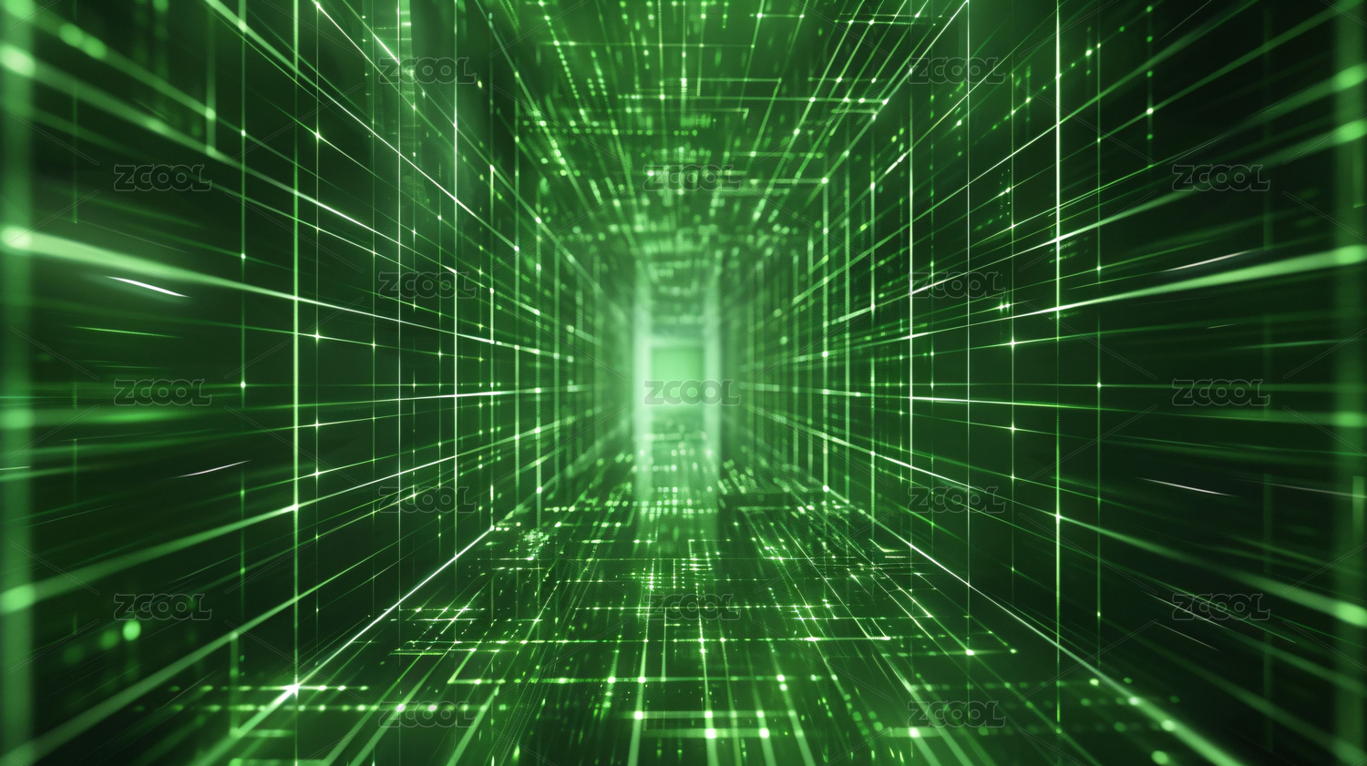 带有霓虹绿灯的未来派科幻隧道、赛博朋克数
