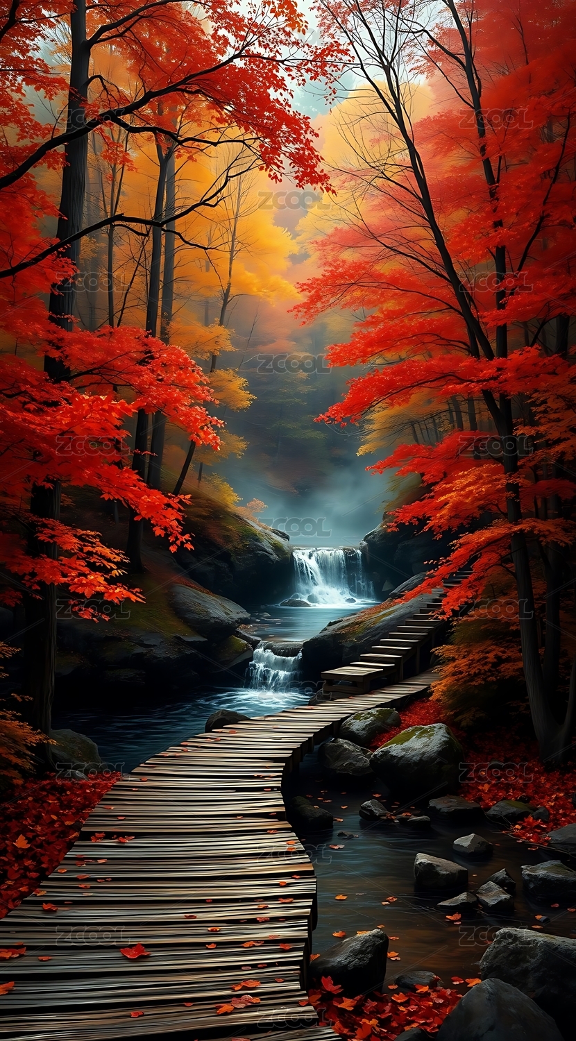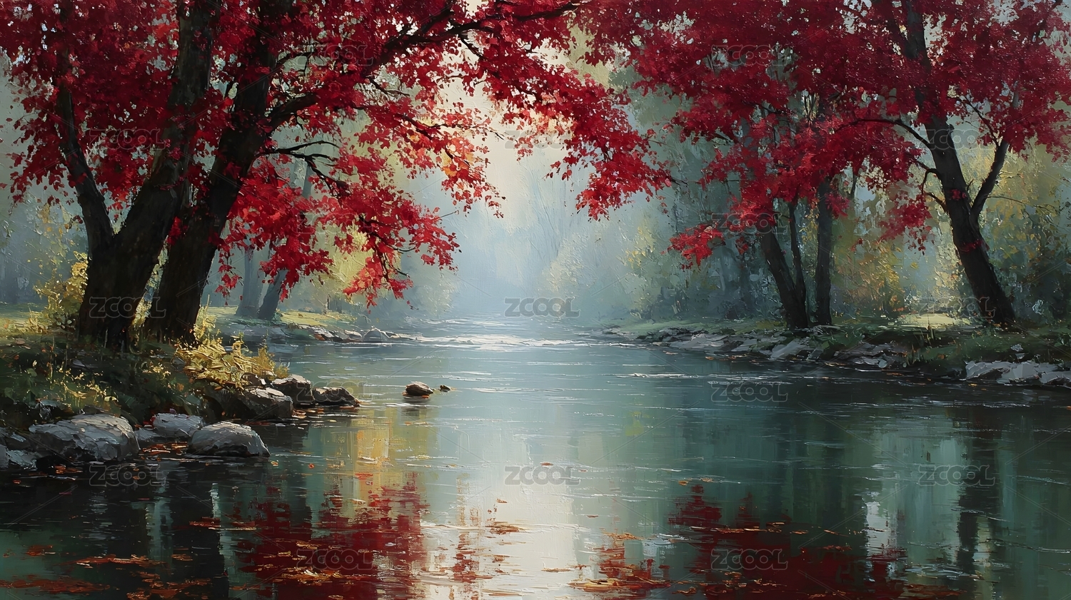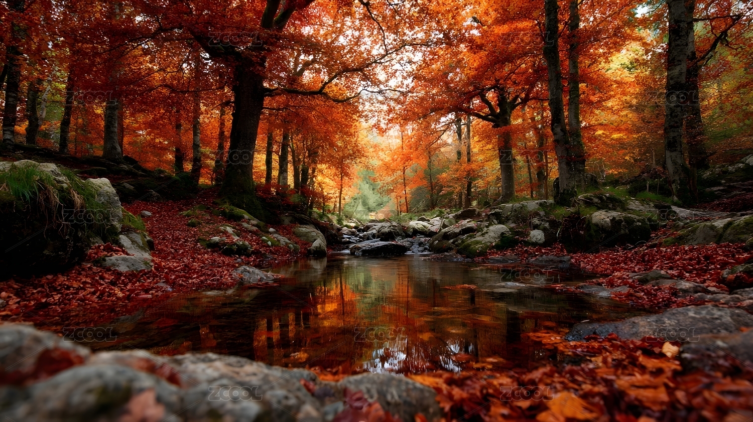 AIGC202402,枫叶,河流,风光,森林,秋天,红叶,溪流,旅行