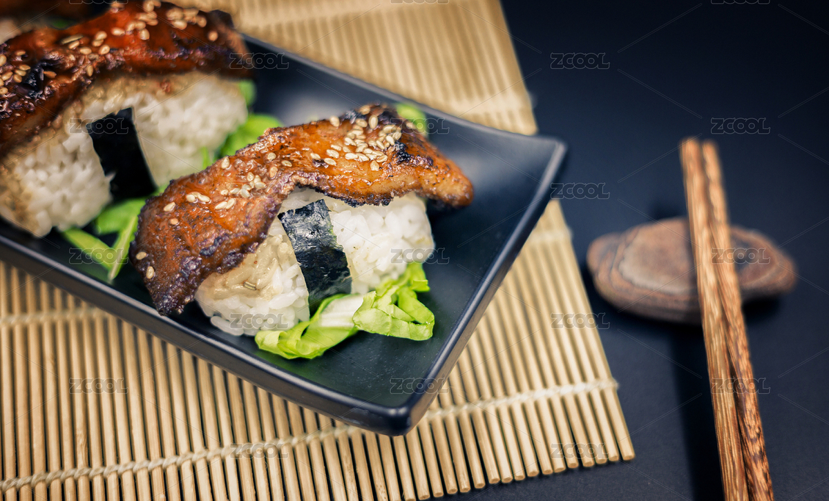 鹅颈白瓷盘装的烤鳗鱼手握寿司摆放在石头上