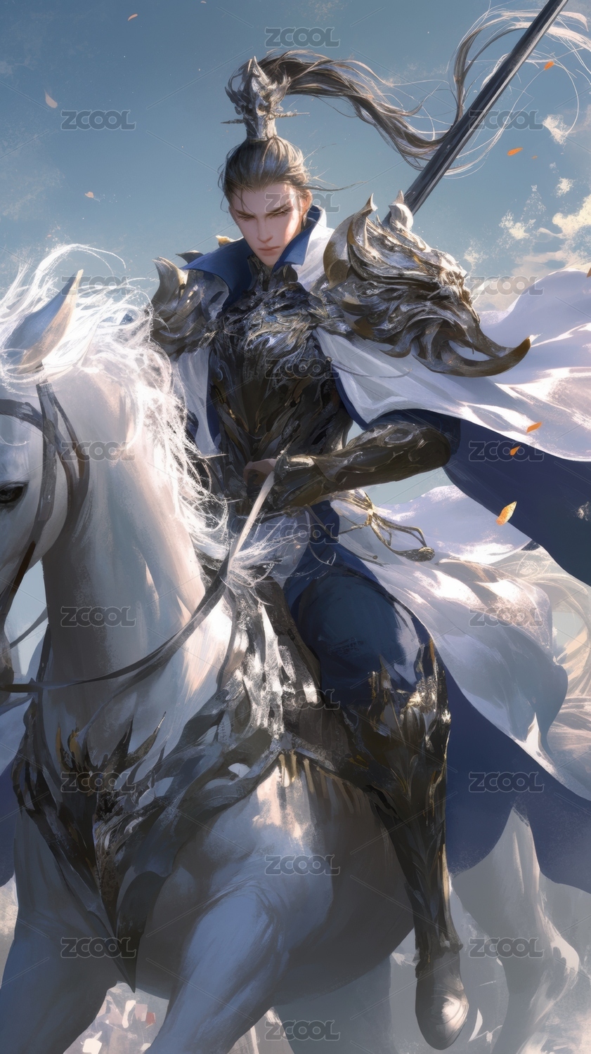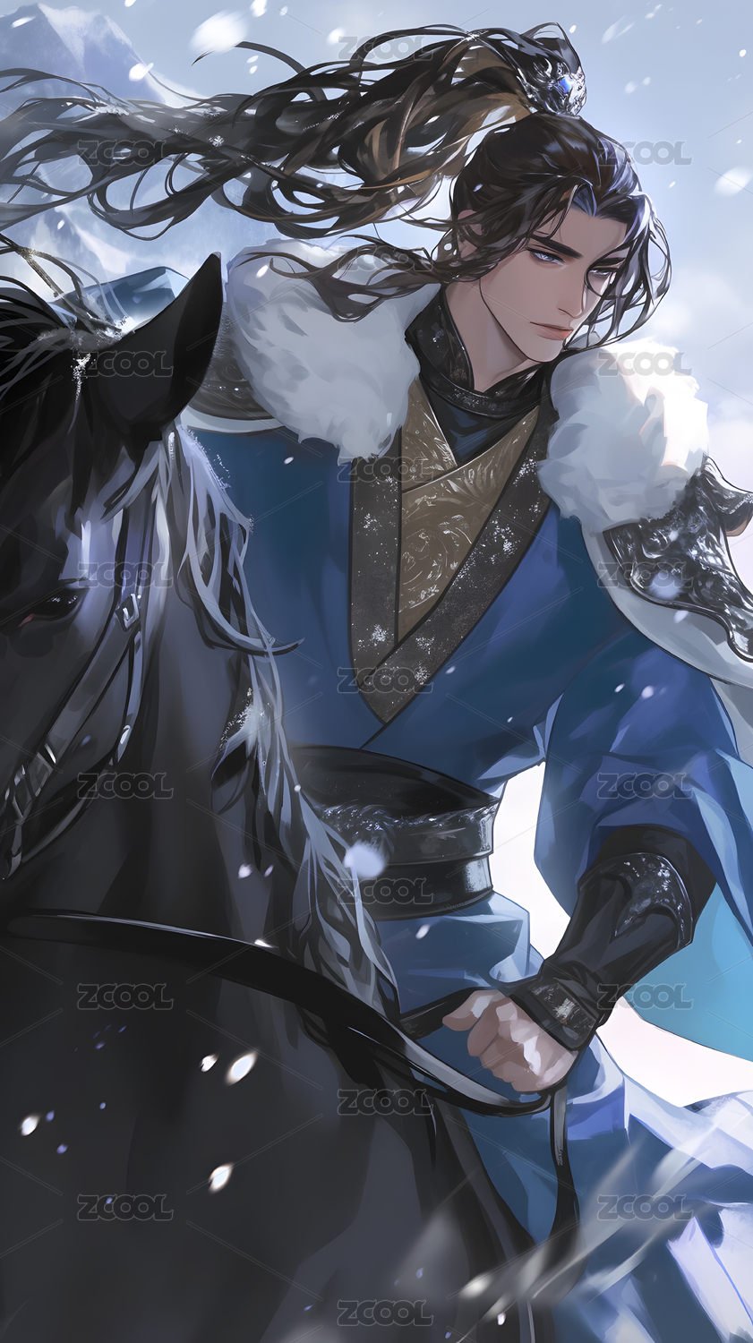 人物,插画,角色,武士,蓝衣,长发,矛,盔甲,冷色调,东方