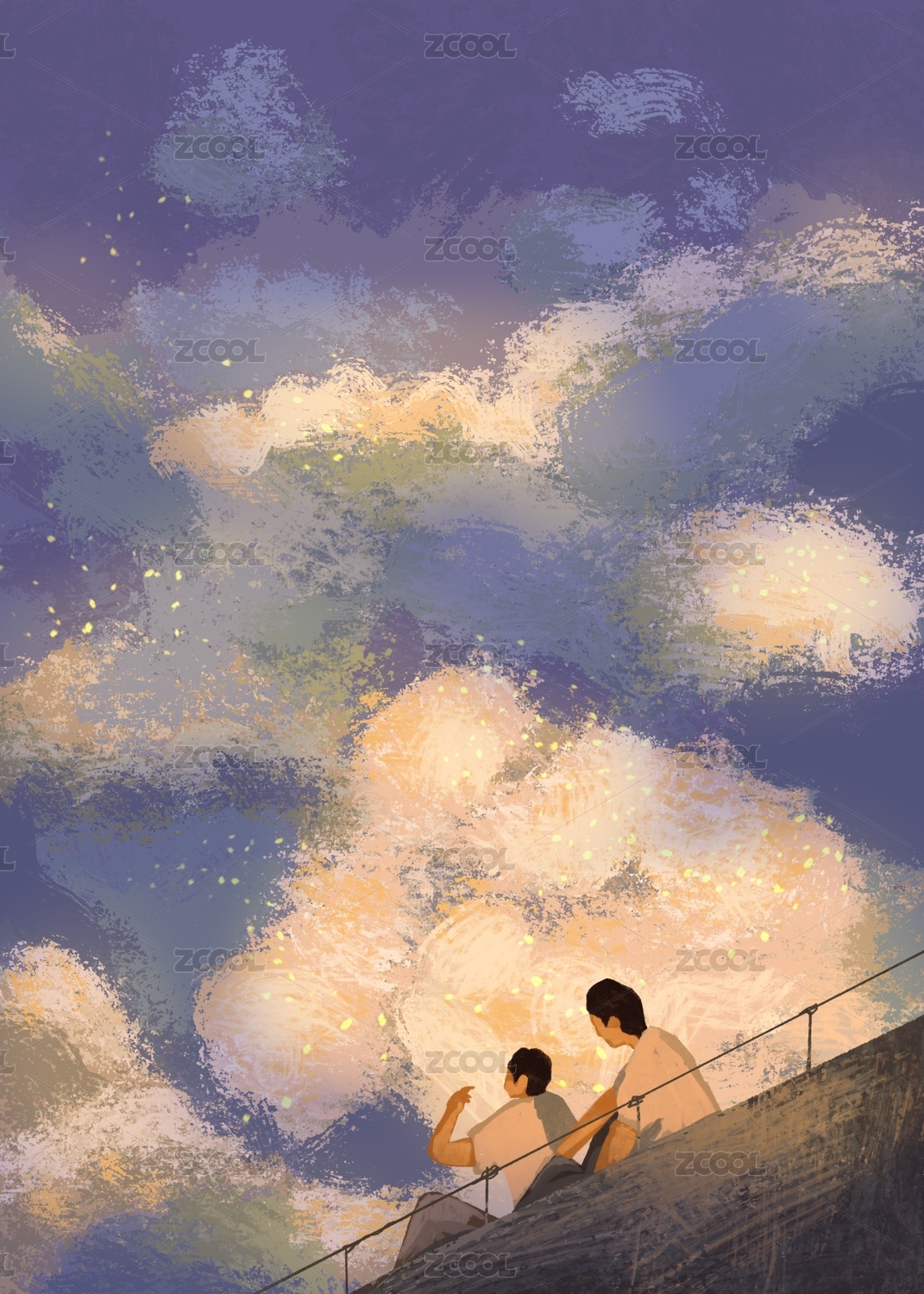 父亲节父子仰望星空插画