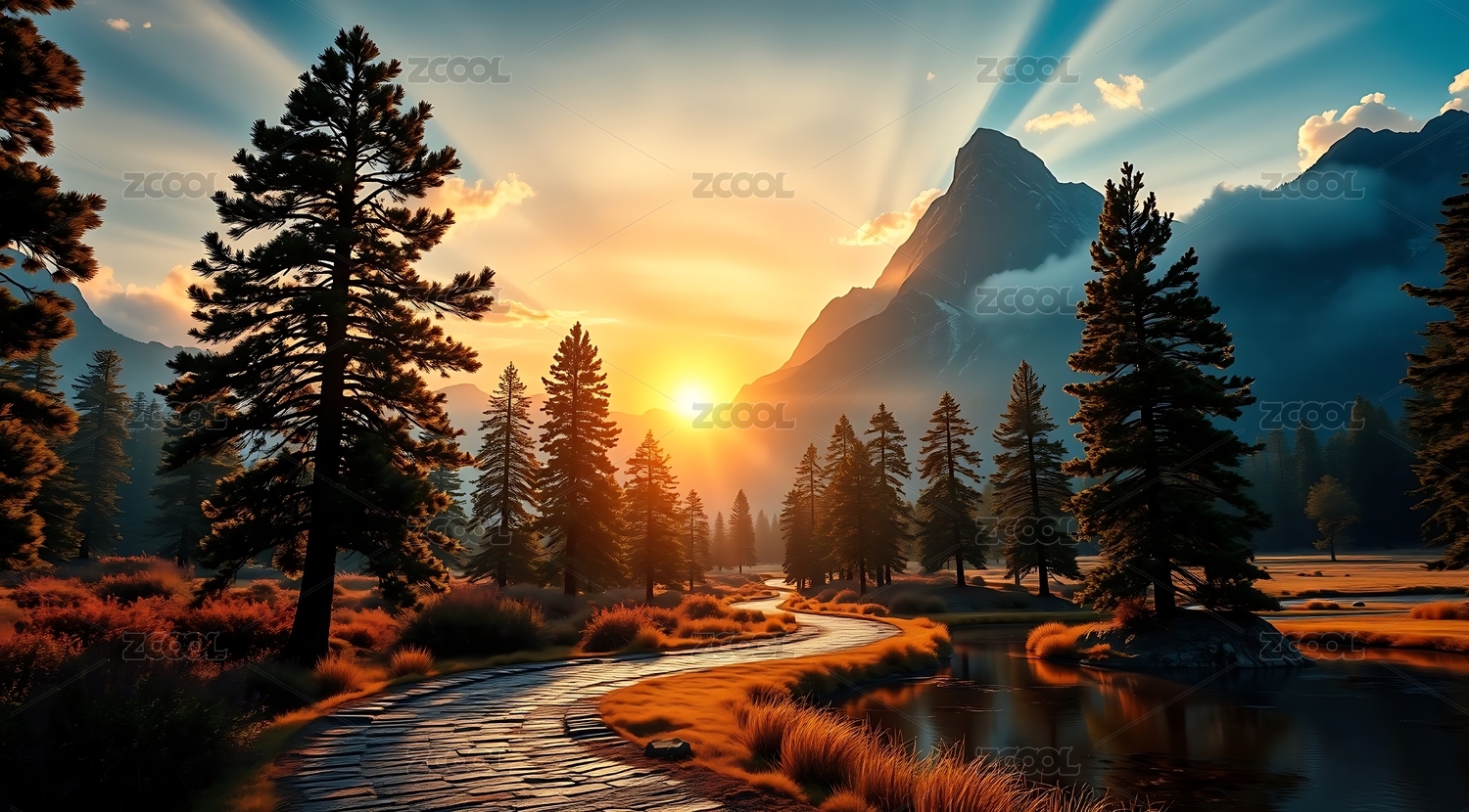 日落,山脉,湖泊,反射,天空,云彩,树木,岩石,风景,自然