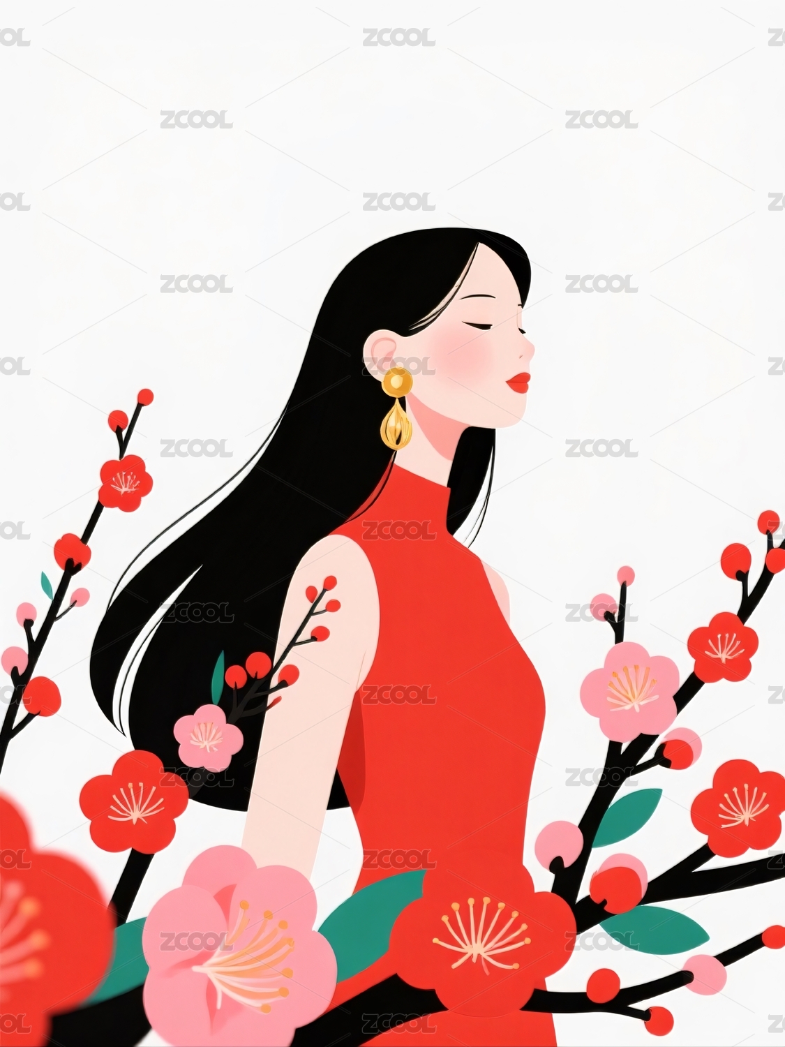 旗袍女子梅枝前站立像