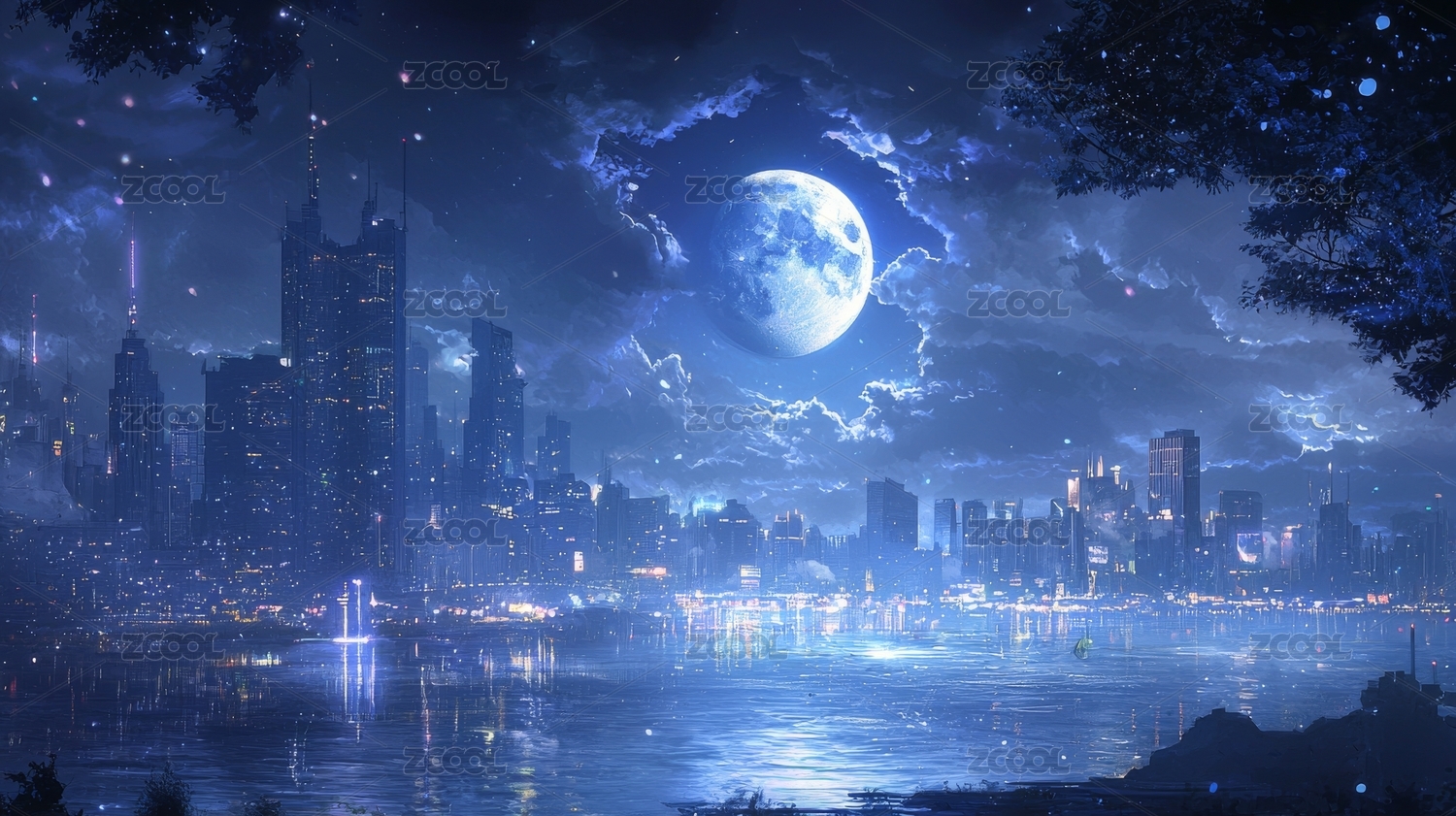 未来,城市,建筑,摩天大楼,河流,反射,天空,云朵,星星,月亮