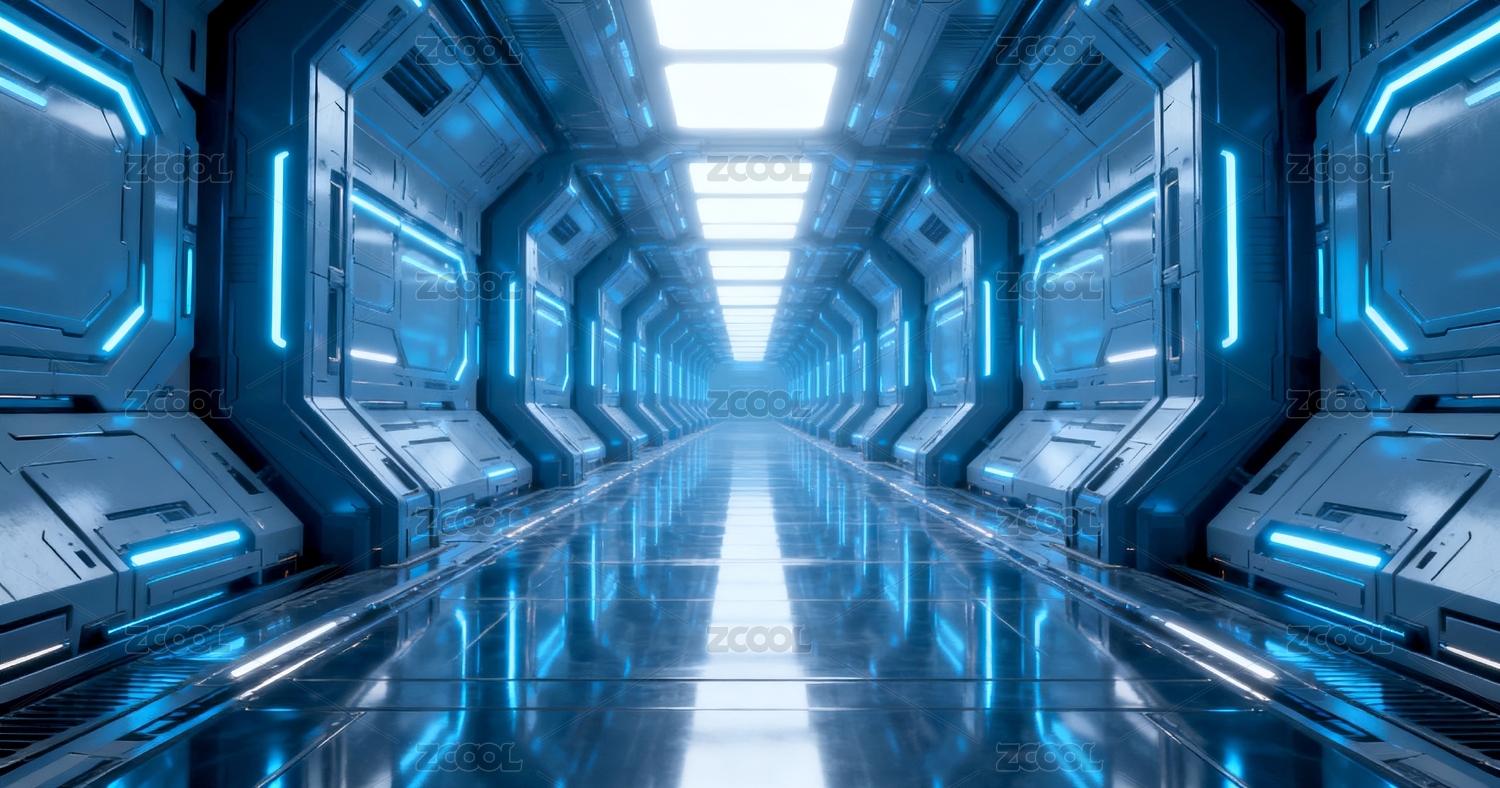未来,科技,走廊,光线,蓝色,金属,反射,对称,深邃,通道