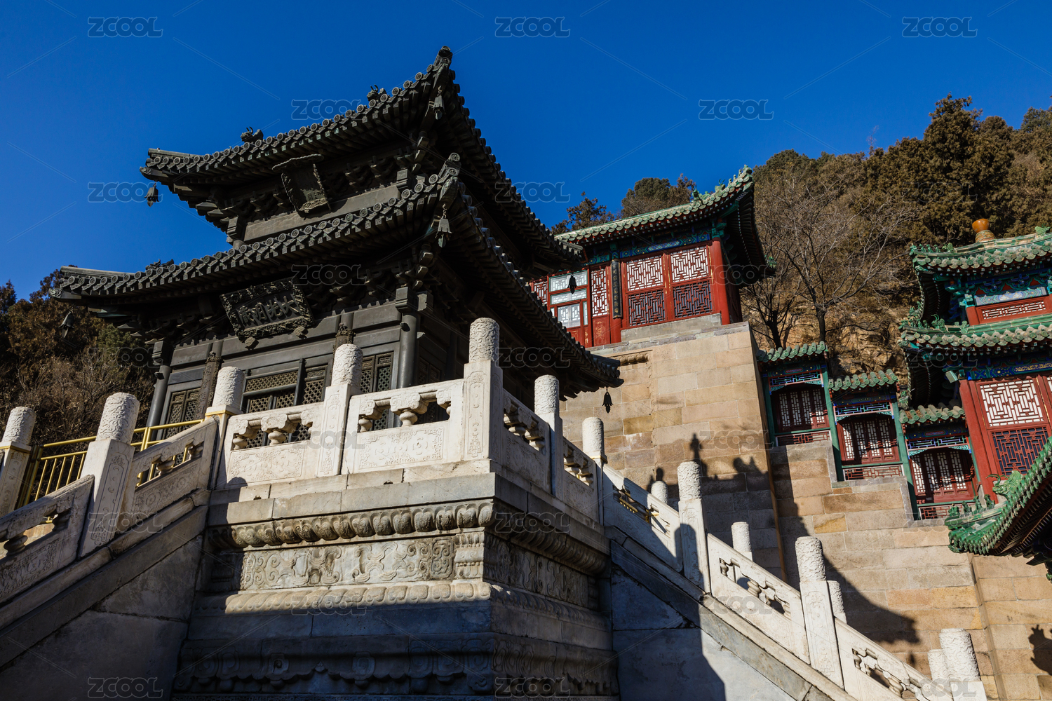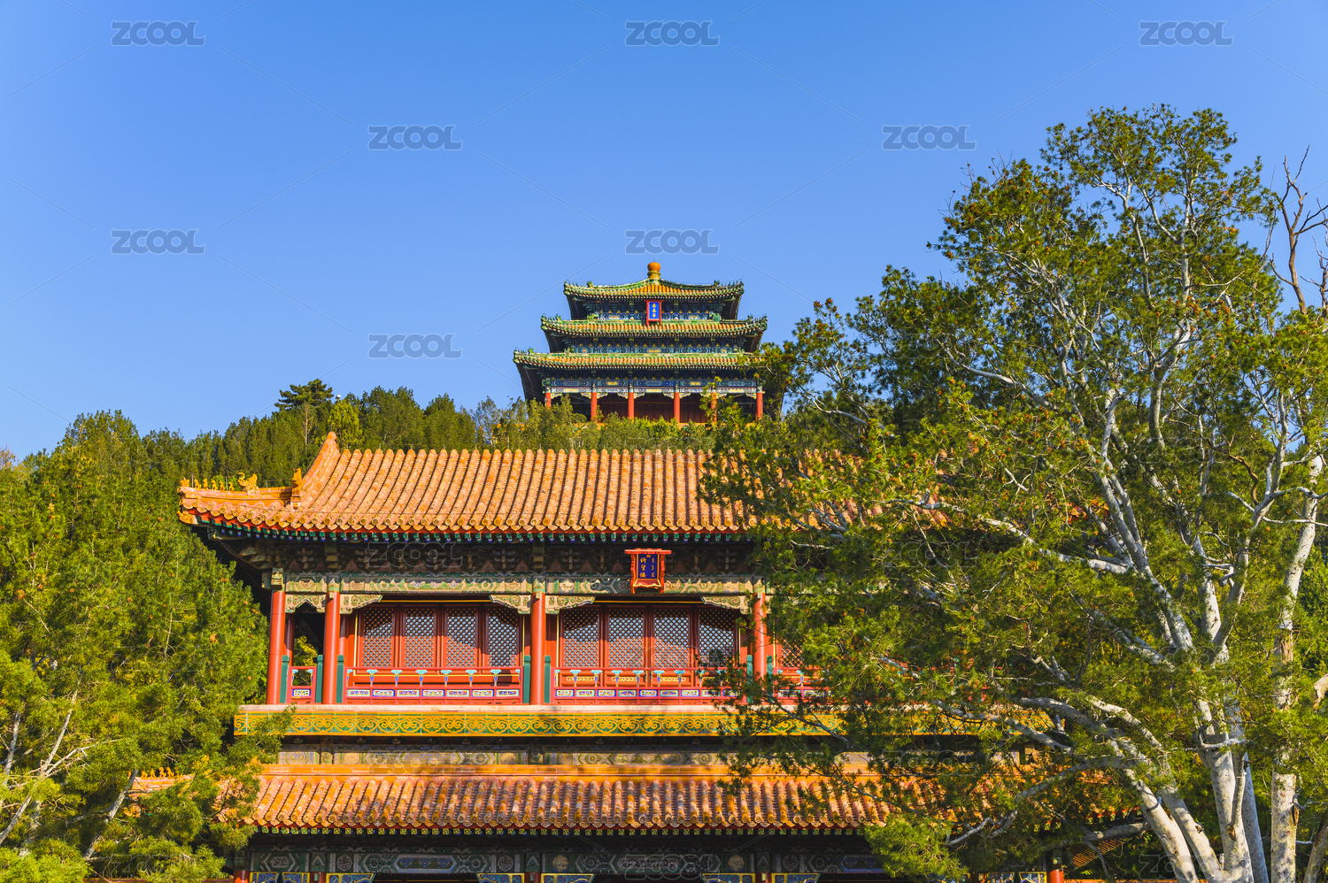 秋天蓝天下的北京颐和园公园的亭台楼阁古建筑