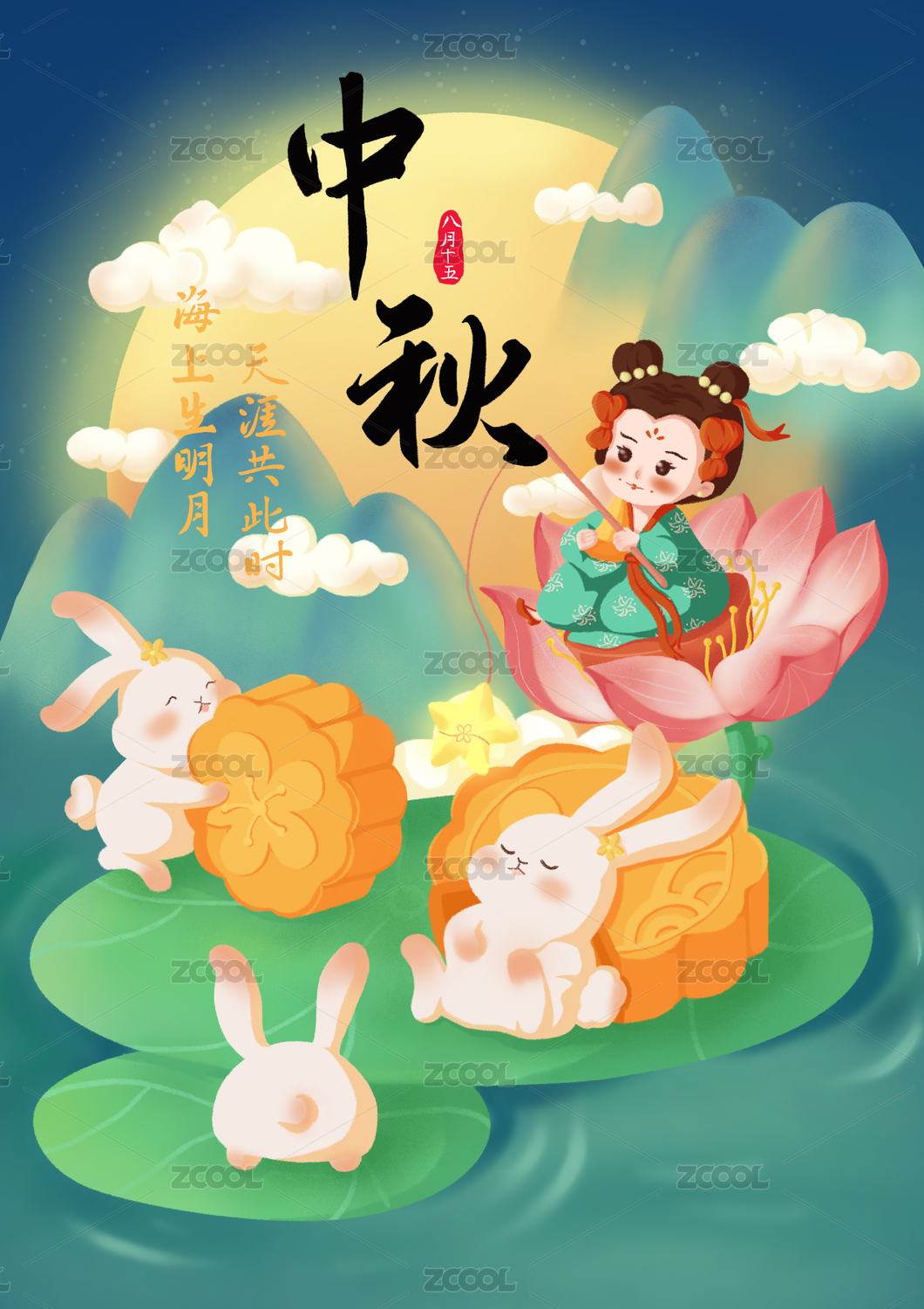 中秋节嫦娥和月亮玉兔荷花等竖版