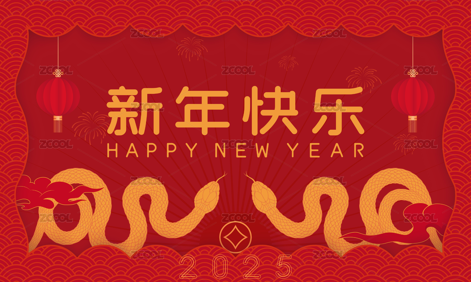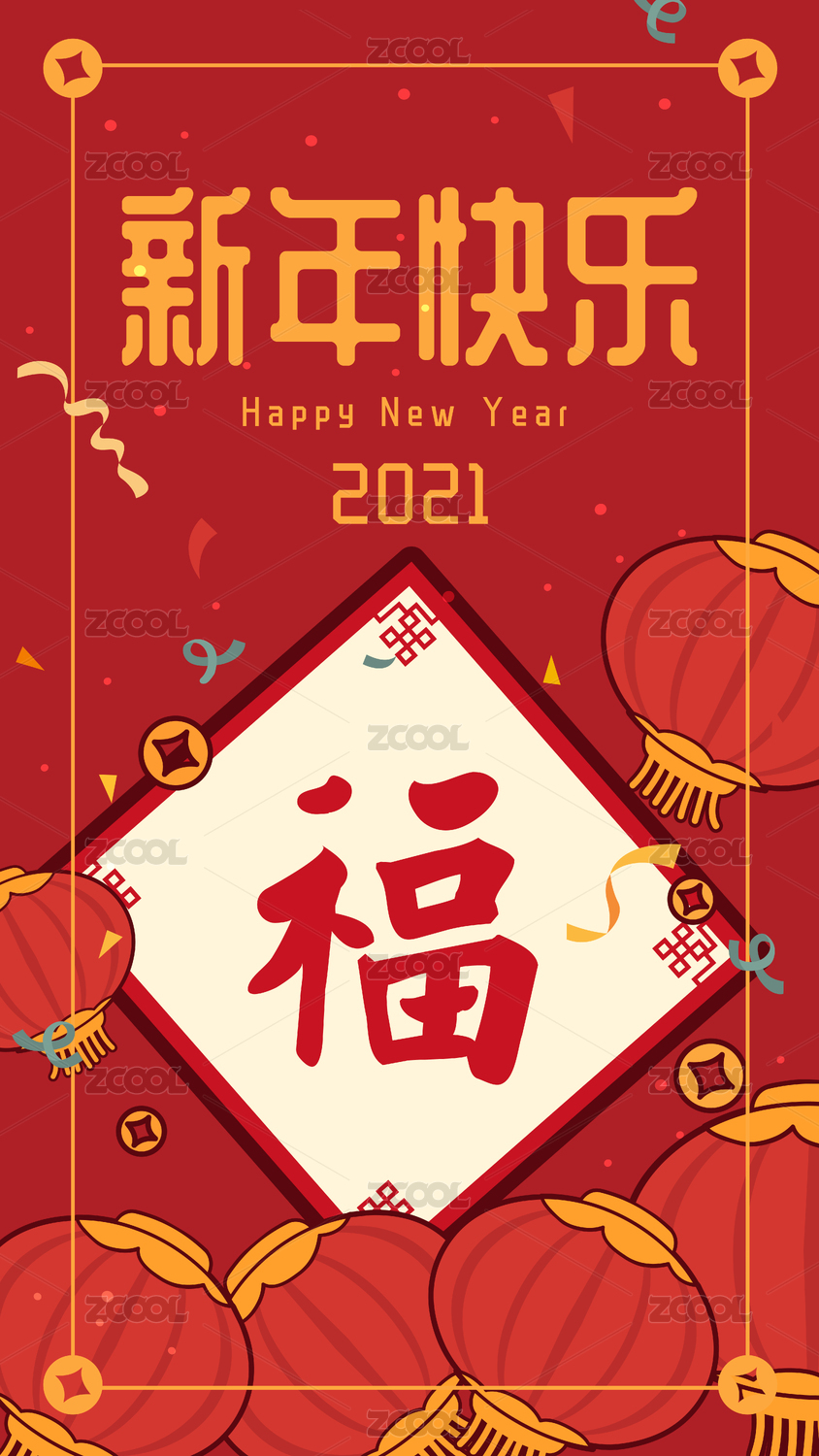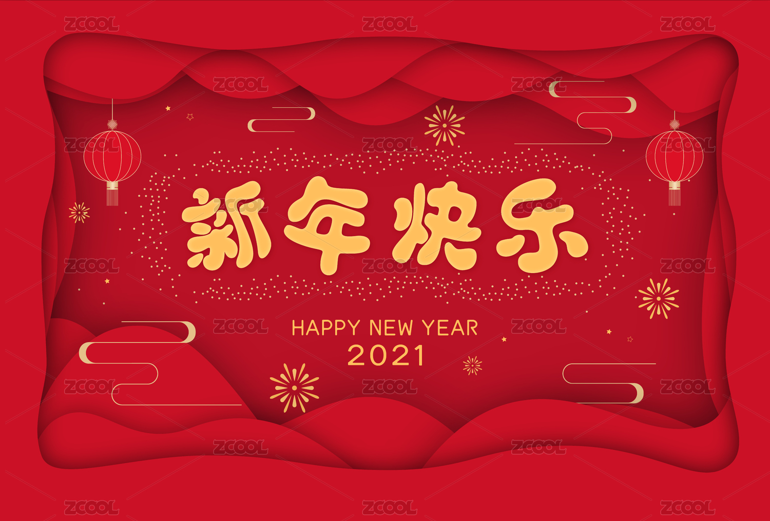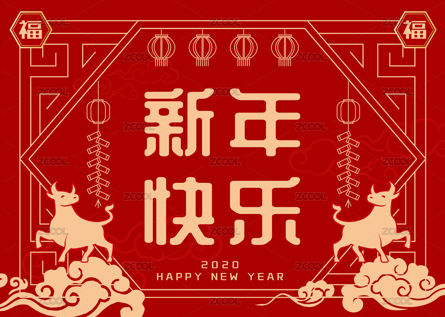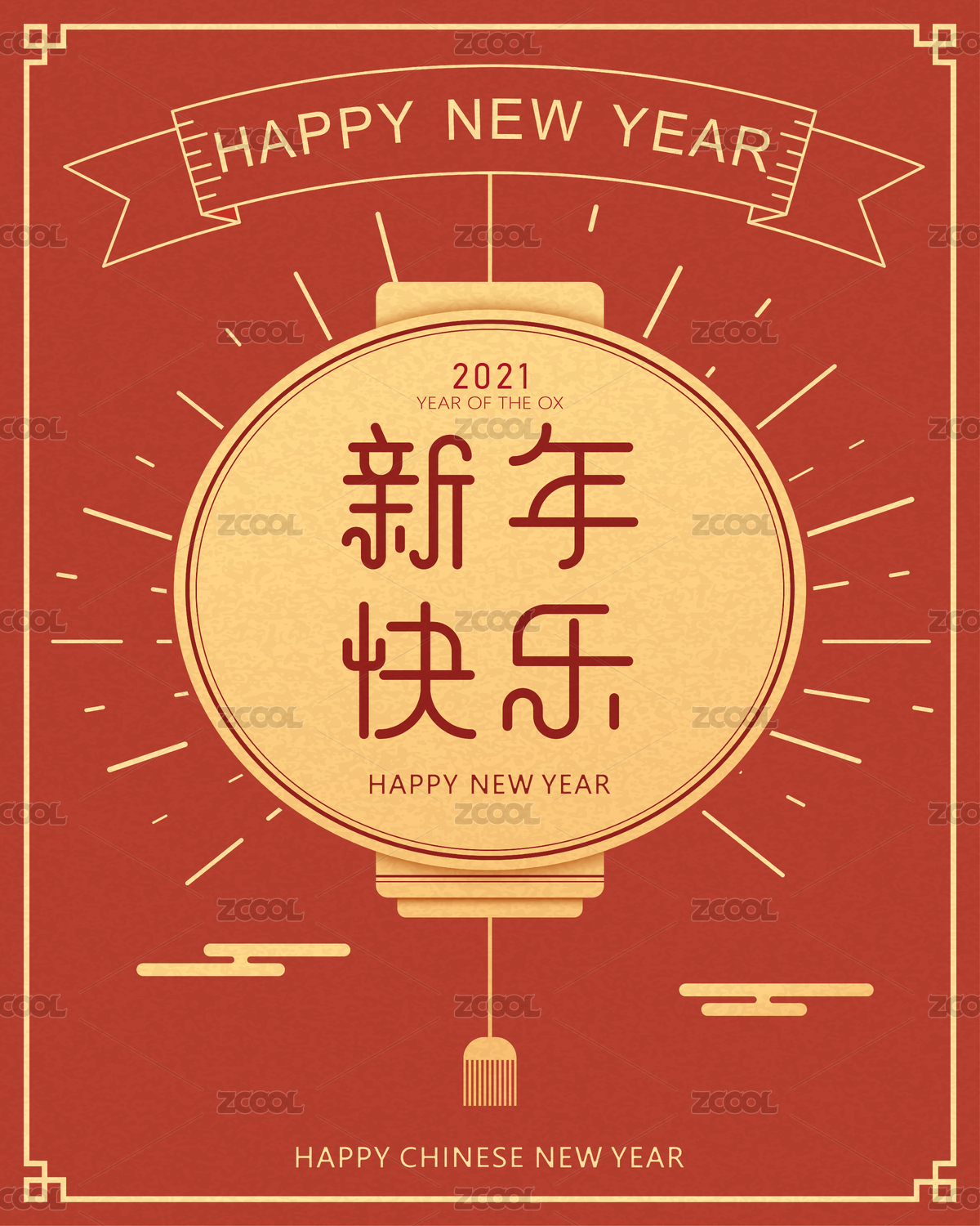 中国传统新年元素,金色背景图,新春对联—新年快乐,红色灯笼和祥云图案