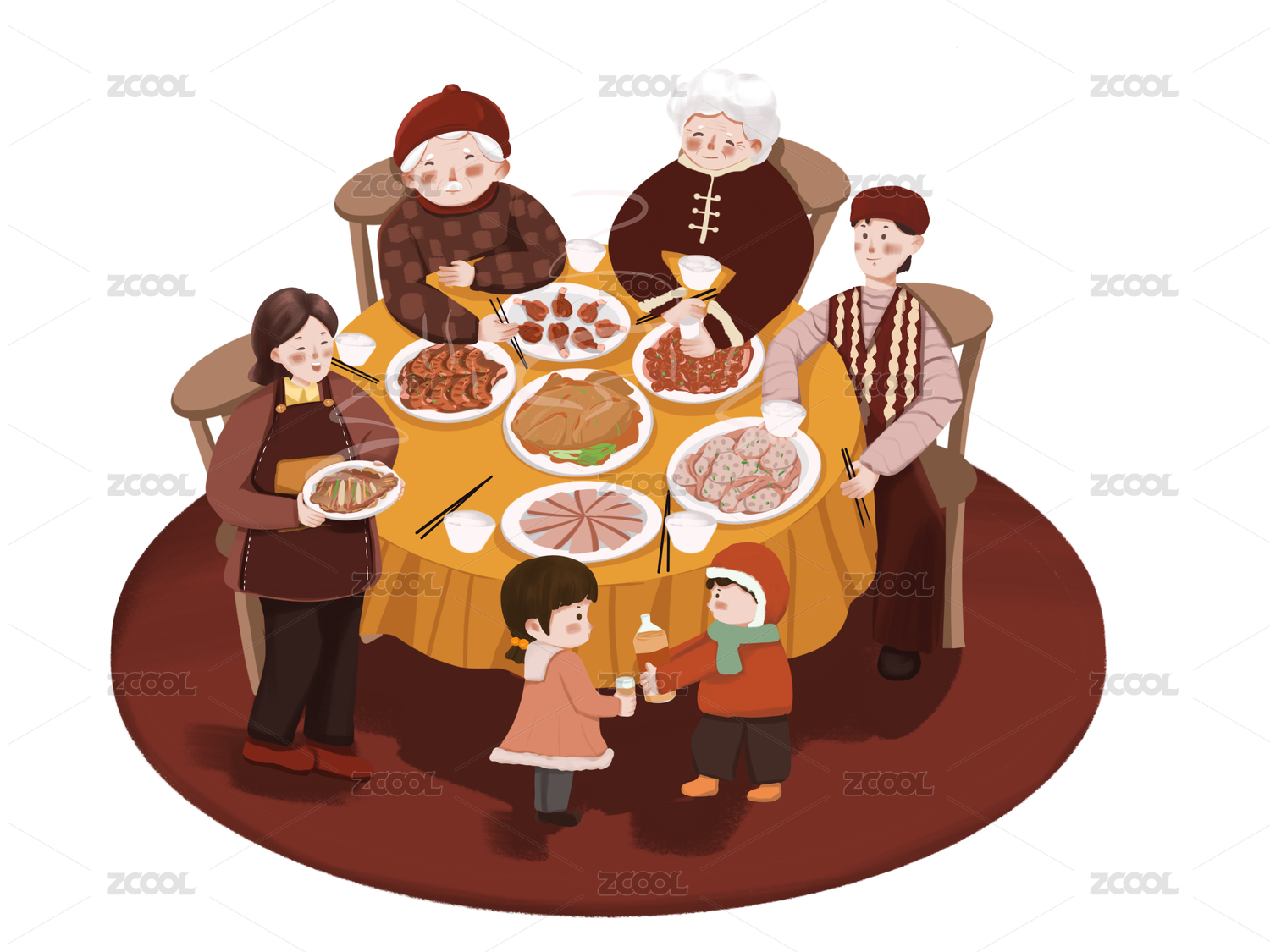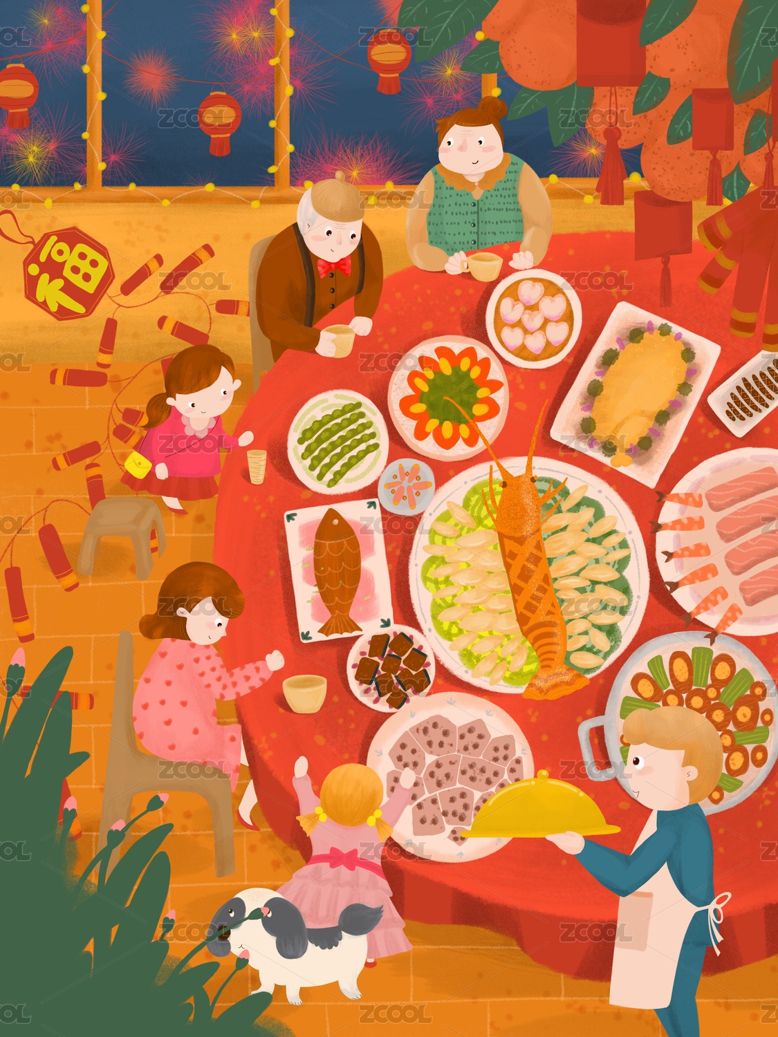 中国人团圆家庭聚餐美味矢量国潮红色插画