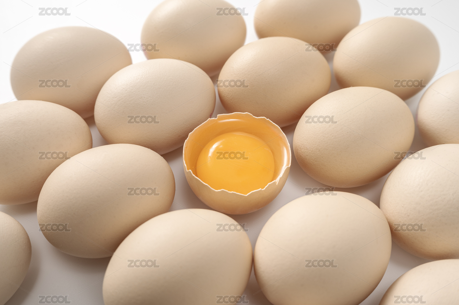 排列整齐的鸡蛋和一枚打开的露出蛋黄的鸡蛋