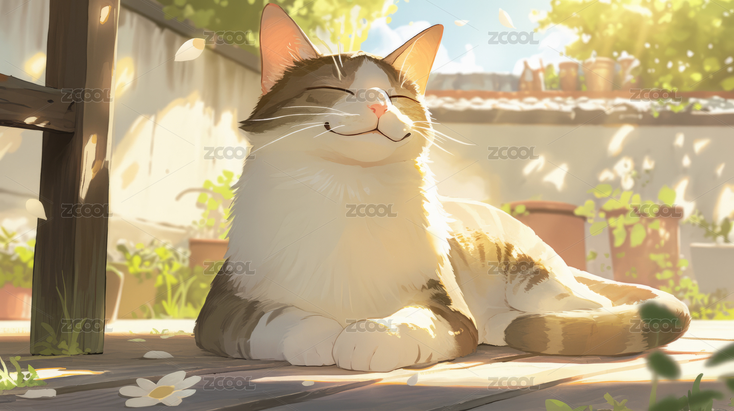 阳光下的猫咪与花朵