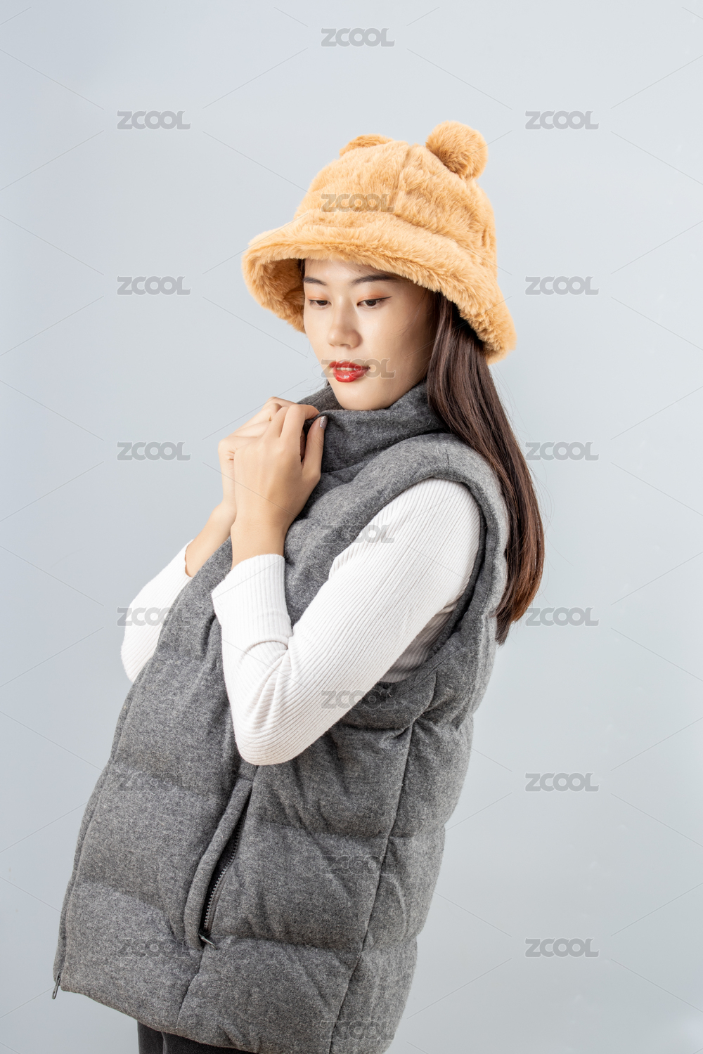 灰色背景里,身穿米色毛衣的戴着黄色绒线帽的美丽亚洲女孩