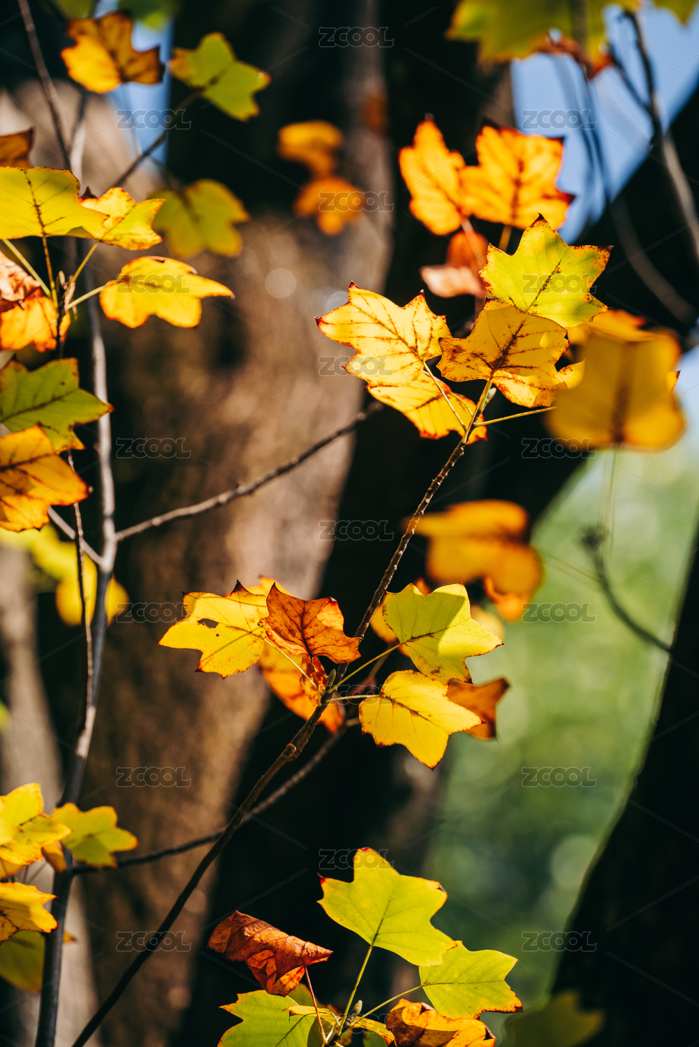 秋天蓝天下多彩的枫叶