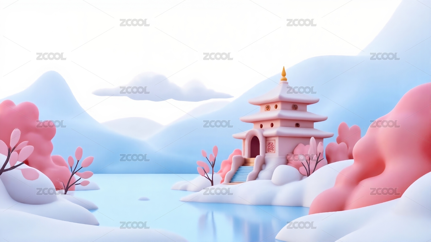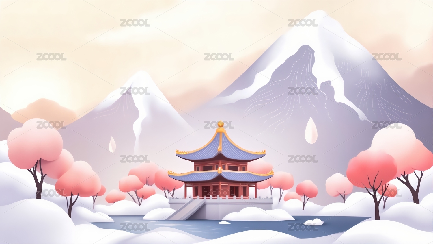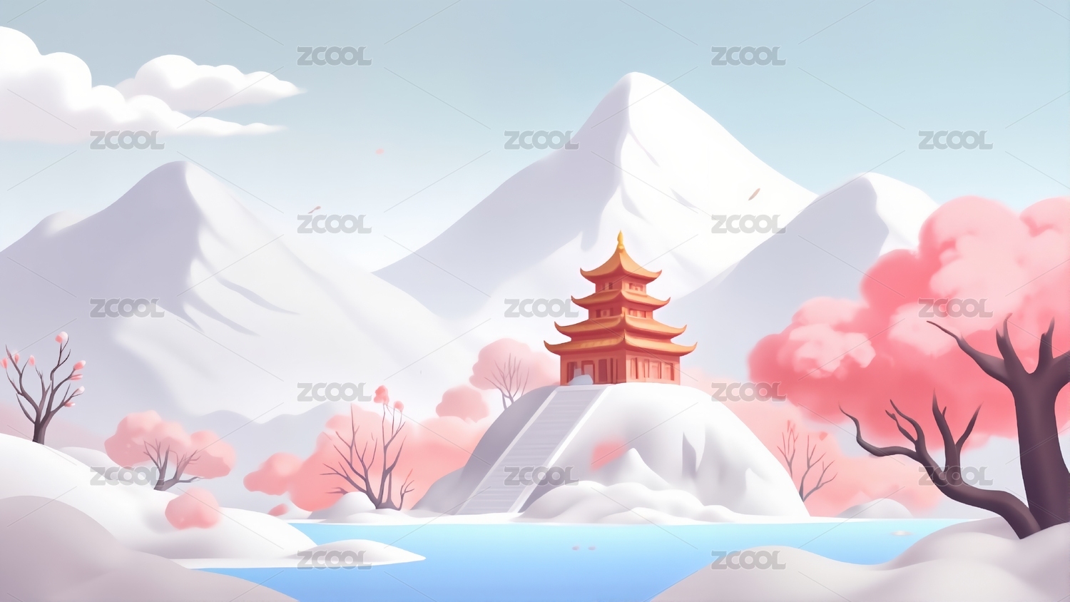 无人,背景,风景,山,中国文化,插画,花,春天,古建筑,建筑