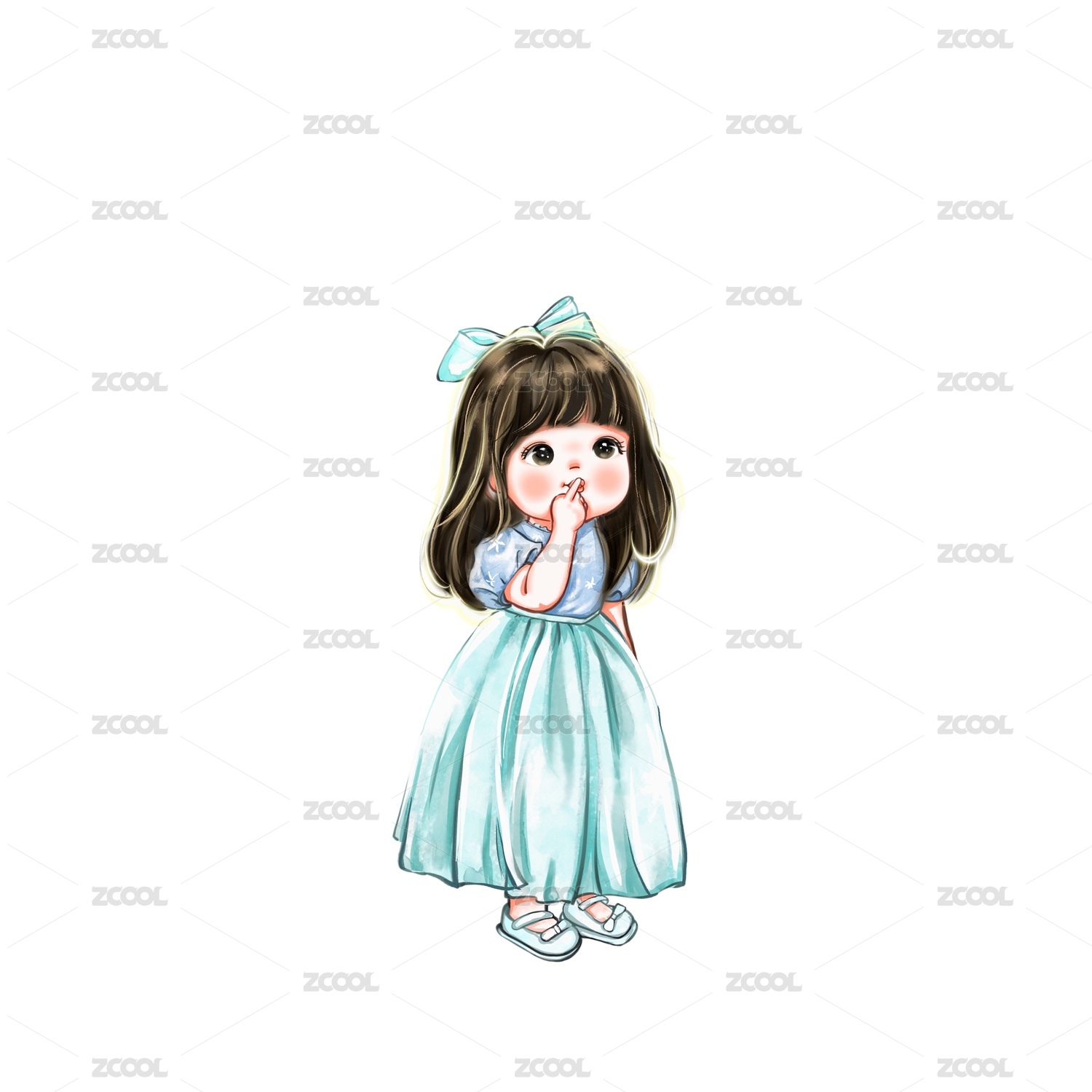 穿着蓝色连衣裙戴着粉色蝴蝶结的卡通女孩高