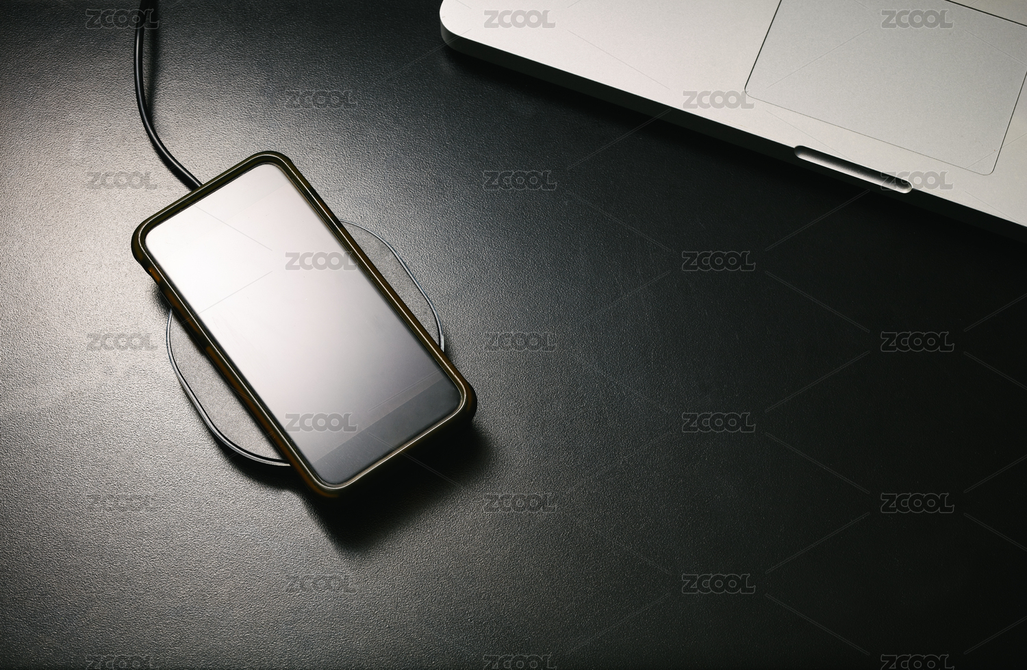 无线充电中的智能手机在黑色桌面上