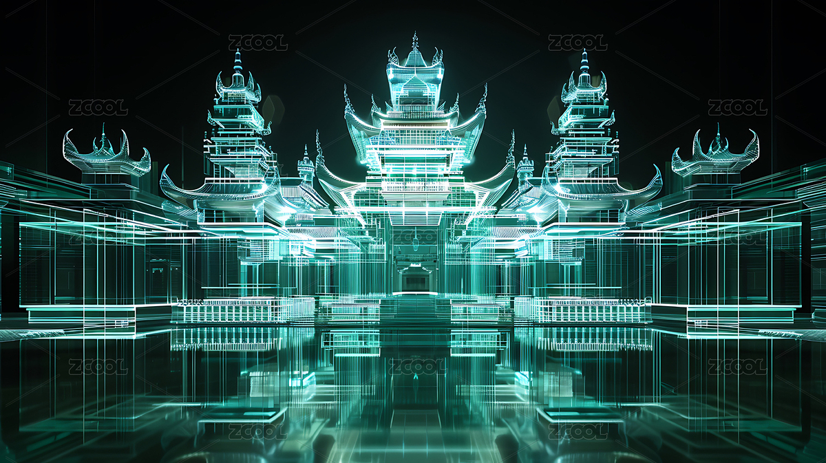 建筑,传统,国风,3d,赛博朋克,文化,宫殿,透明,发光,超现实