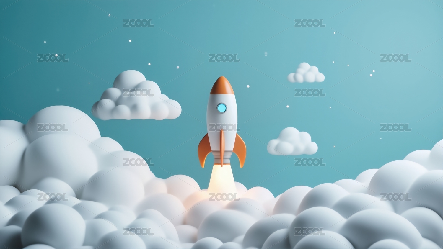 卡通火箭在云端飞行