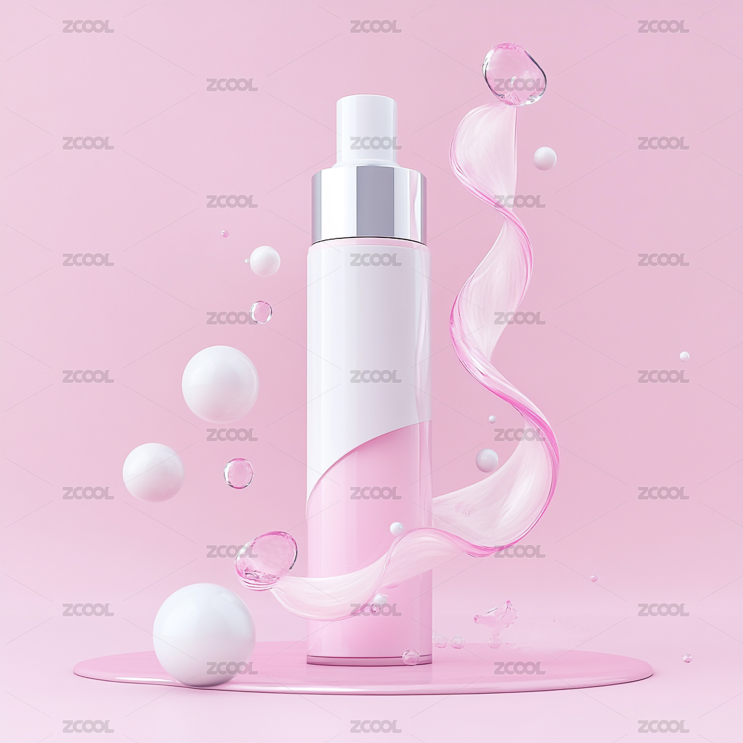 三维渲染的化妆品白色塑料瓶子的粉色场景