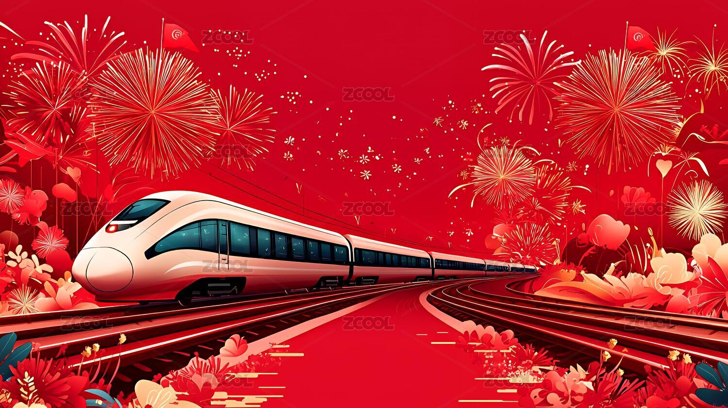 红色喜庆烟花绽放的背景下高铁动车春运素材