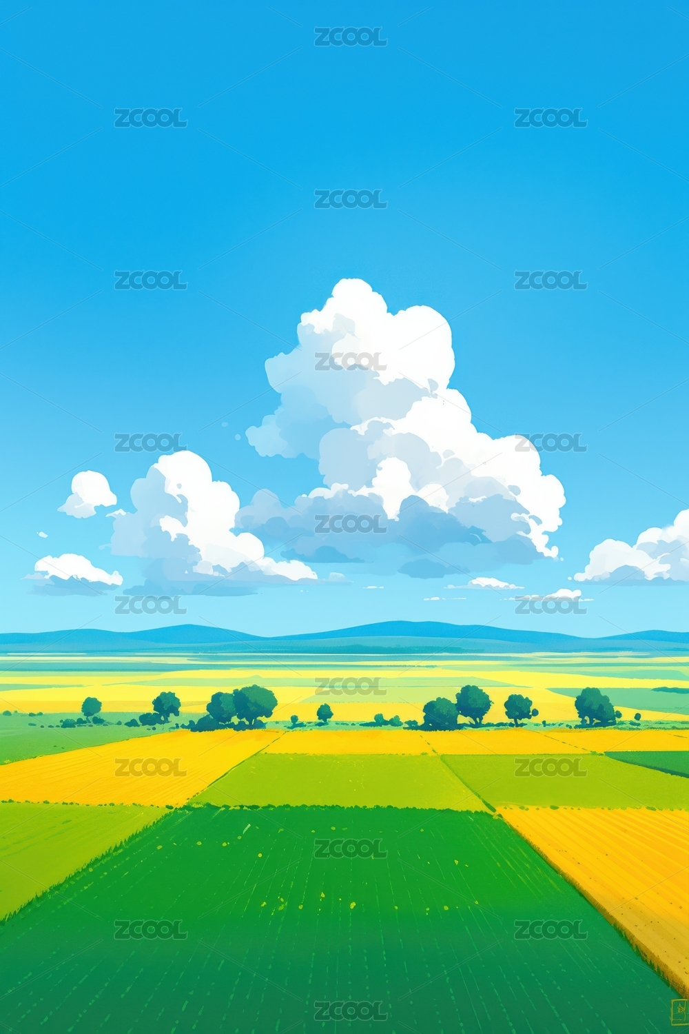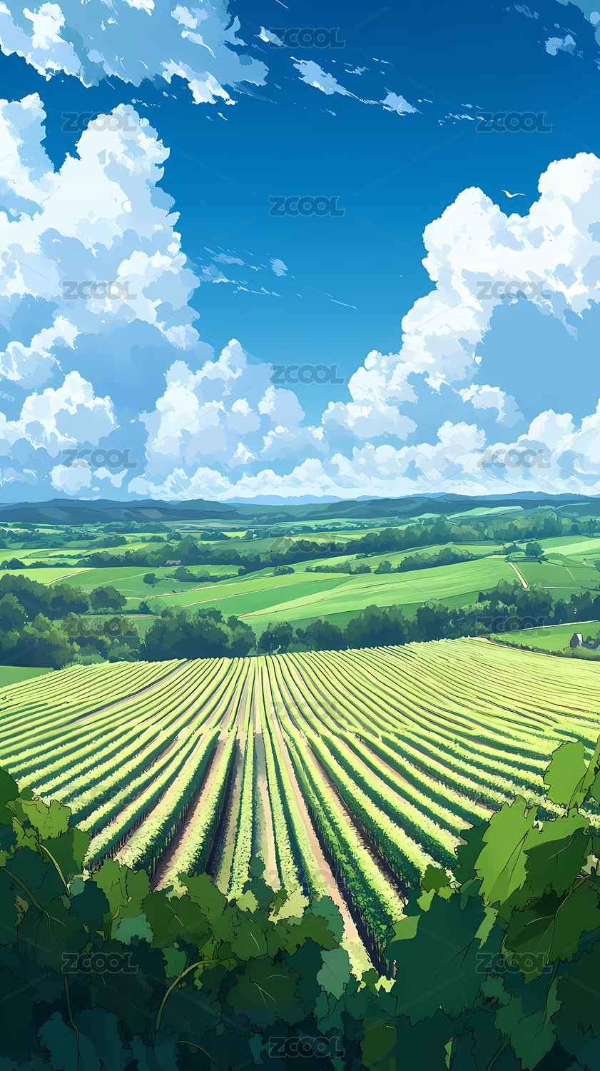 蓝天白云下的绿色田野