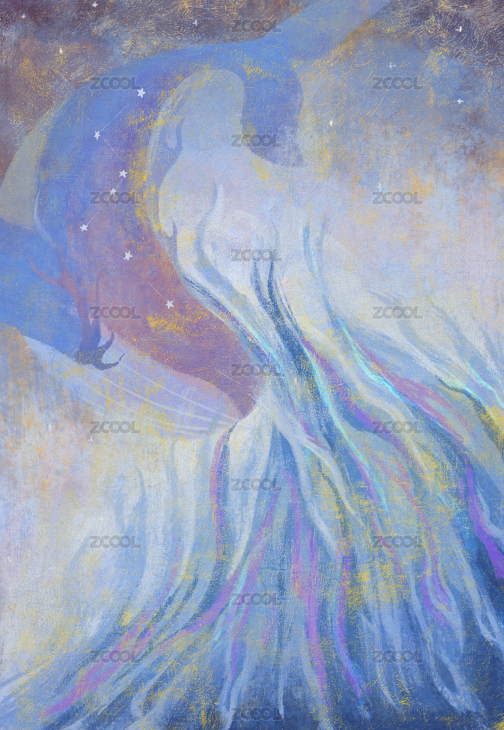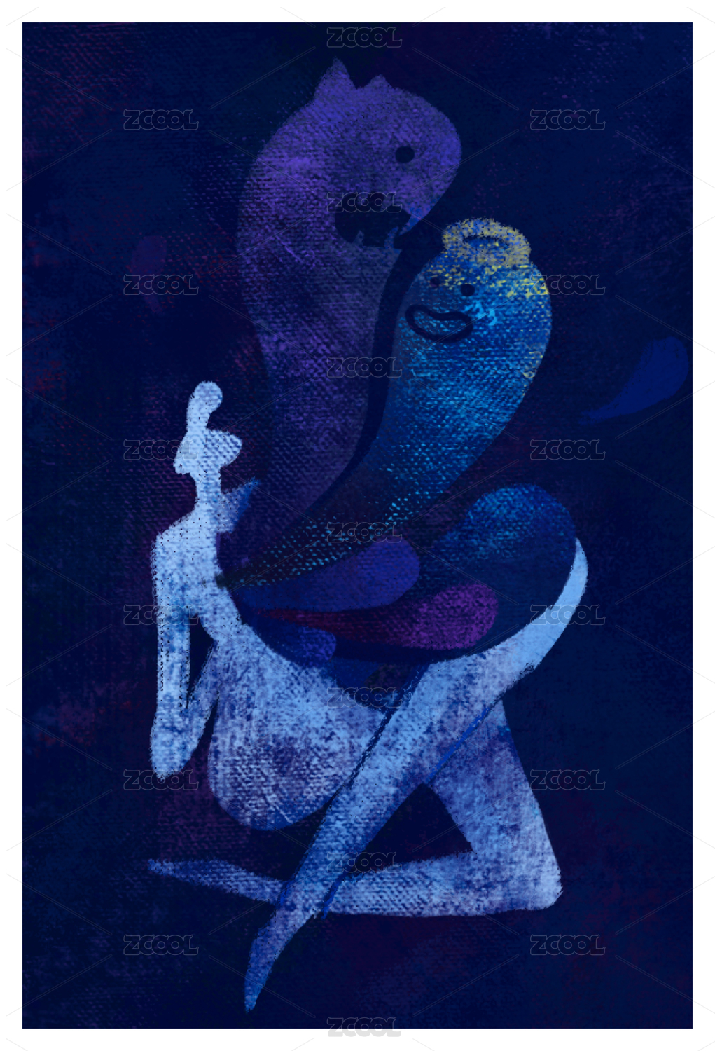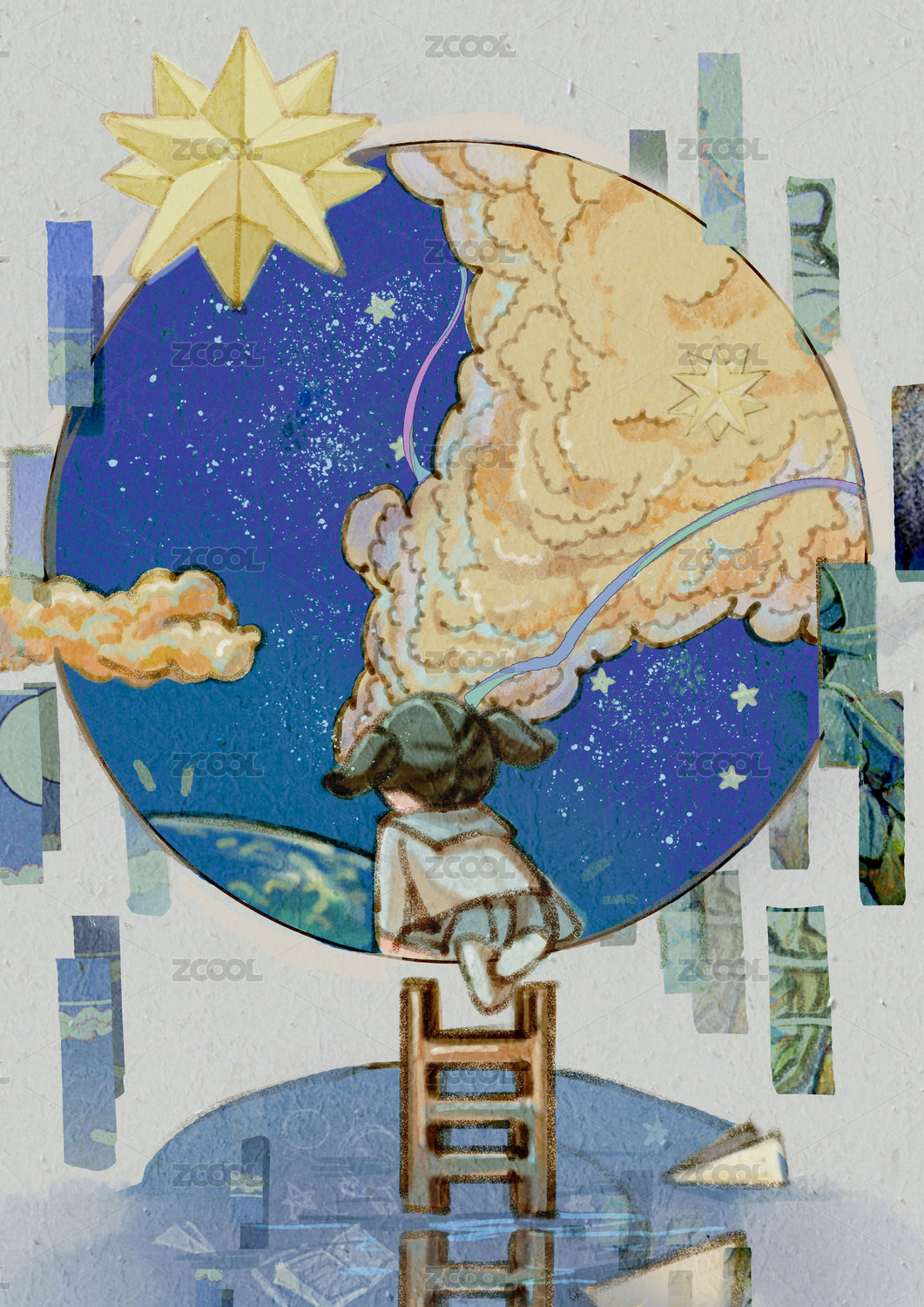 夜晚大海上有一只水母形状的船被女孩拉着走