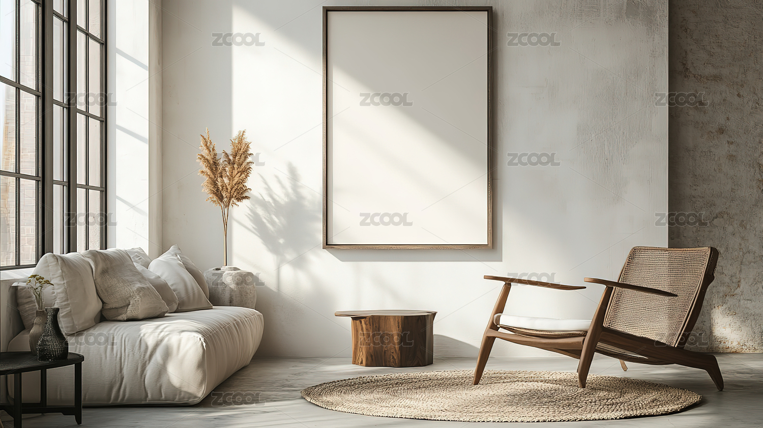 白色室内空墙面与混凝土地板有扶手椅与日光