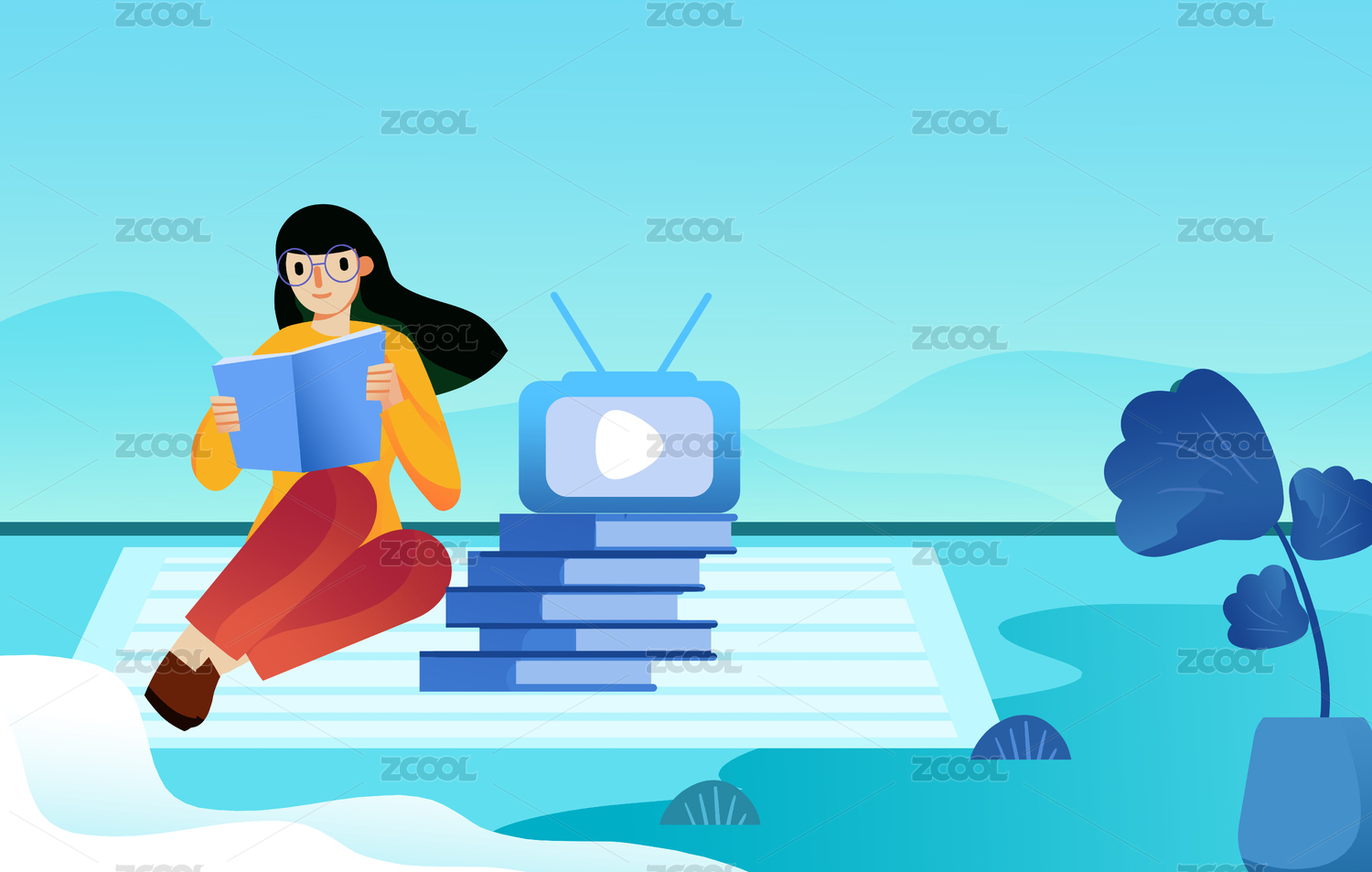 卡通手绘手拿书本看书学习插画