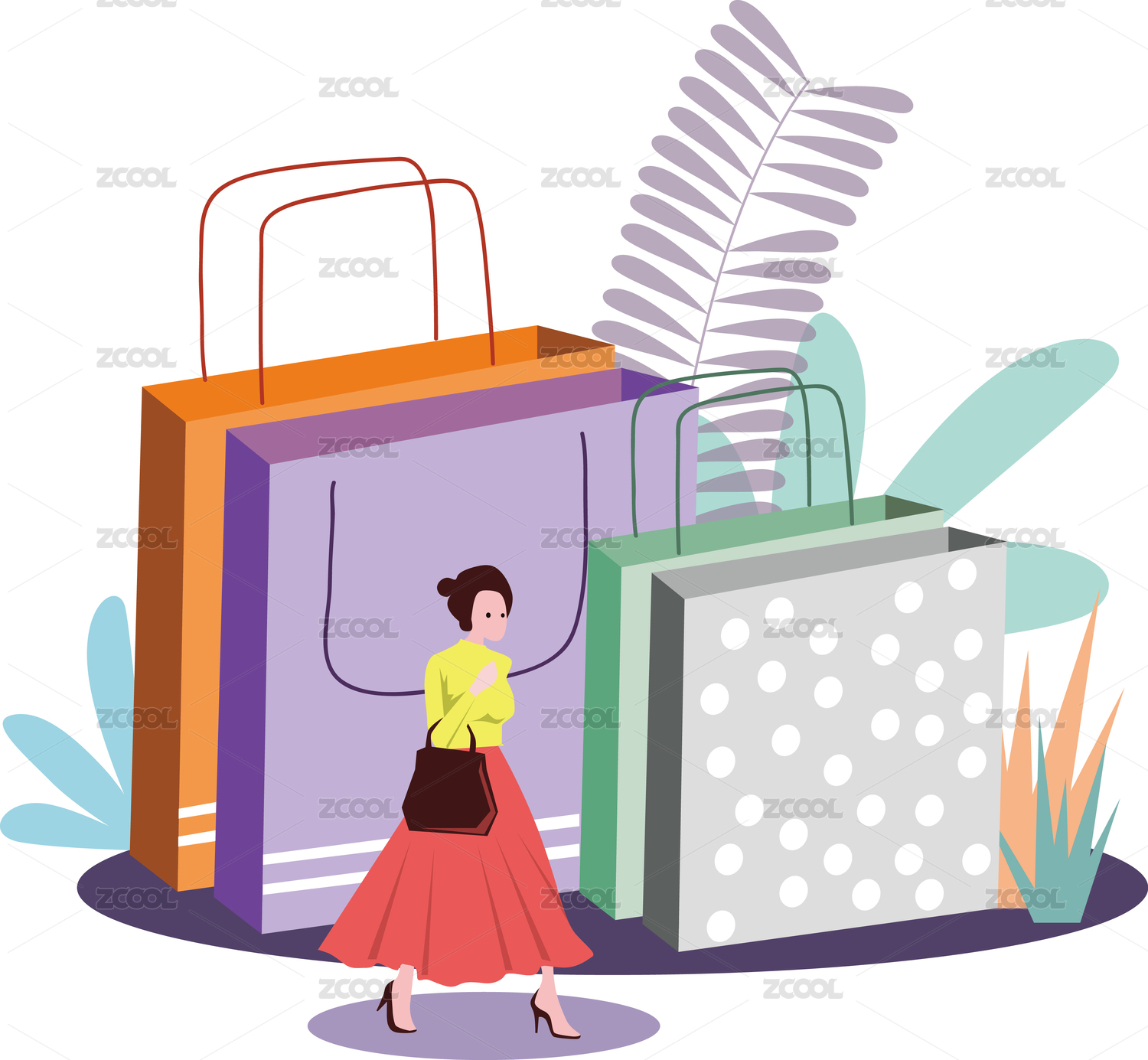 一个成年男性在有荷叶的背景上拿着购物袋购