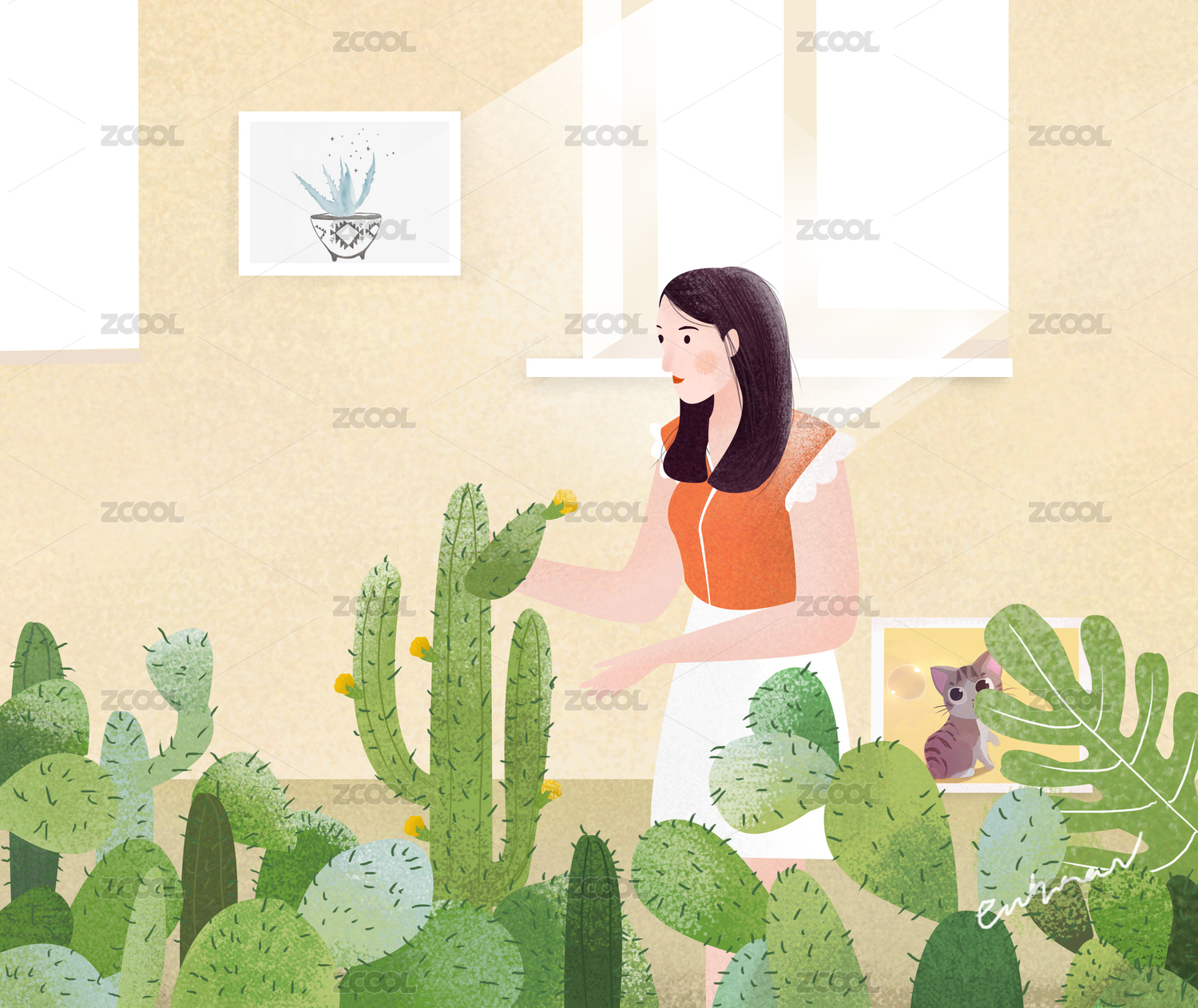 插画女孩与花朵