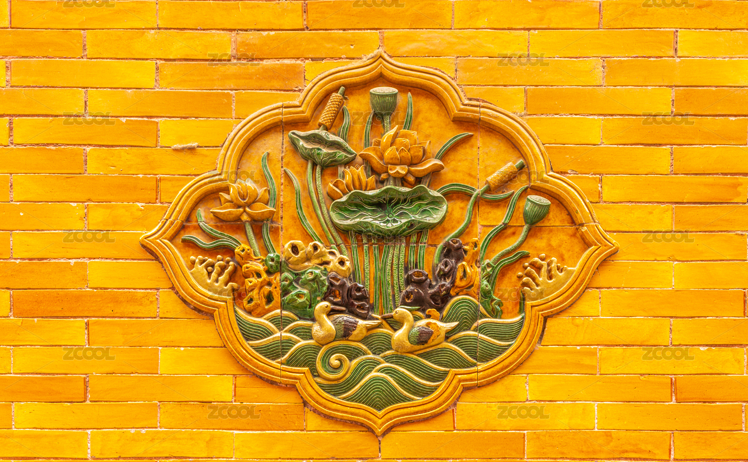 中国故宫的彩色鸳鸯琉璃瓦浮雕