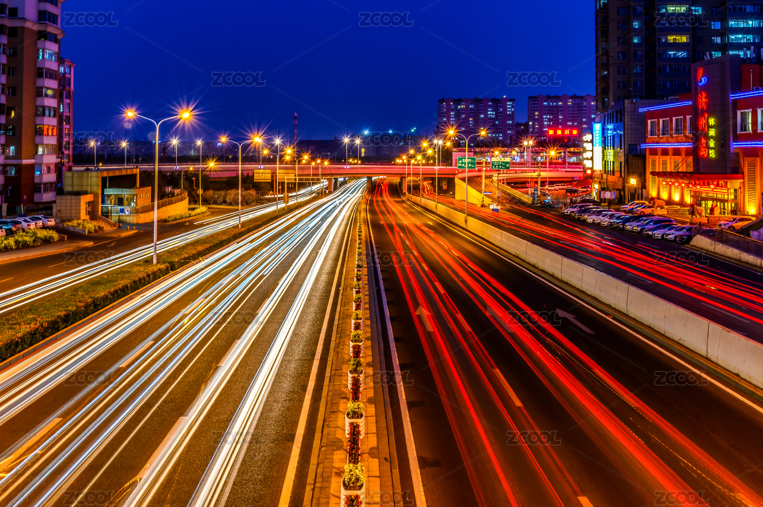 城市建筑夜景风光,飞驰的汽车尾灯形成的光的轨迹