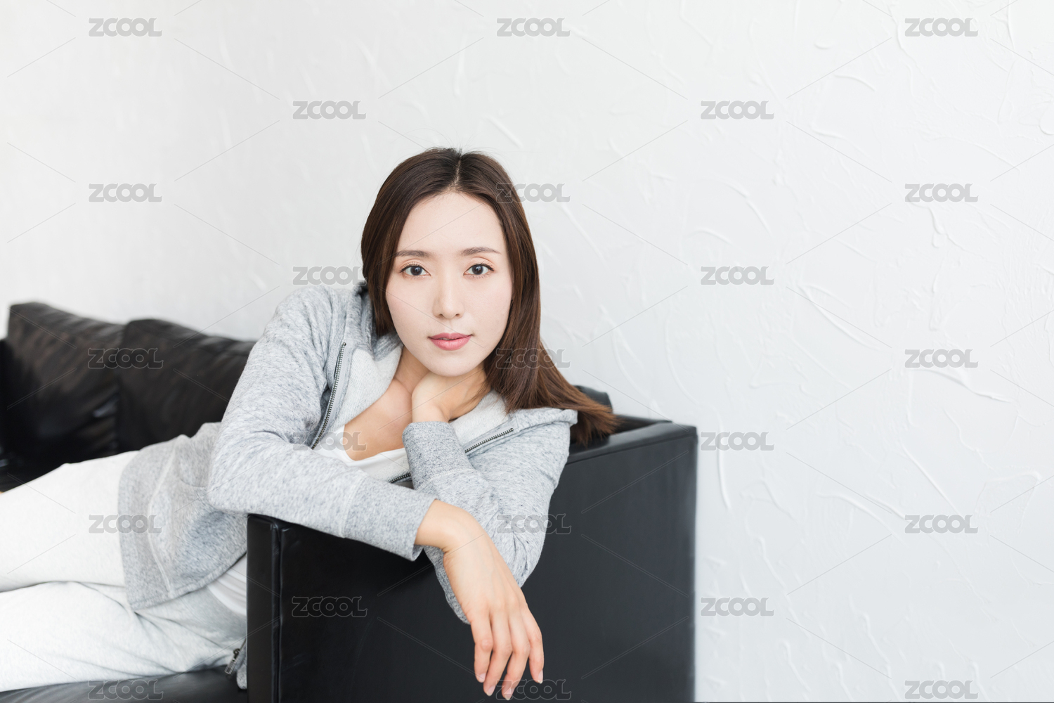 甜美女生穿着居家服靠着沙发坐着
