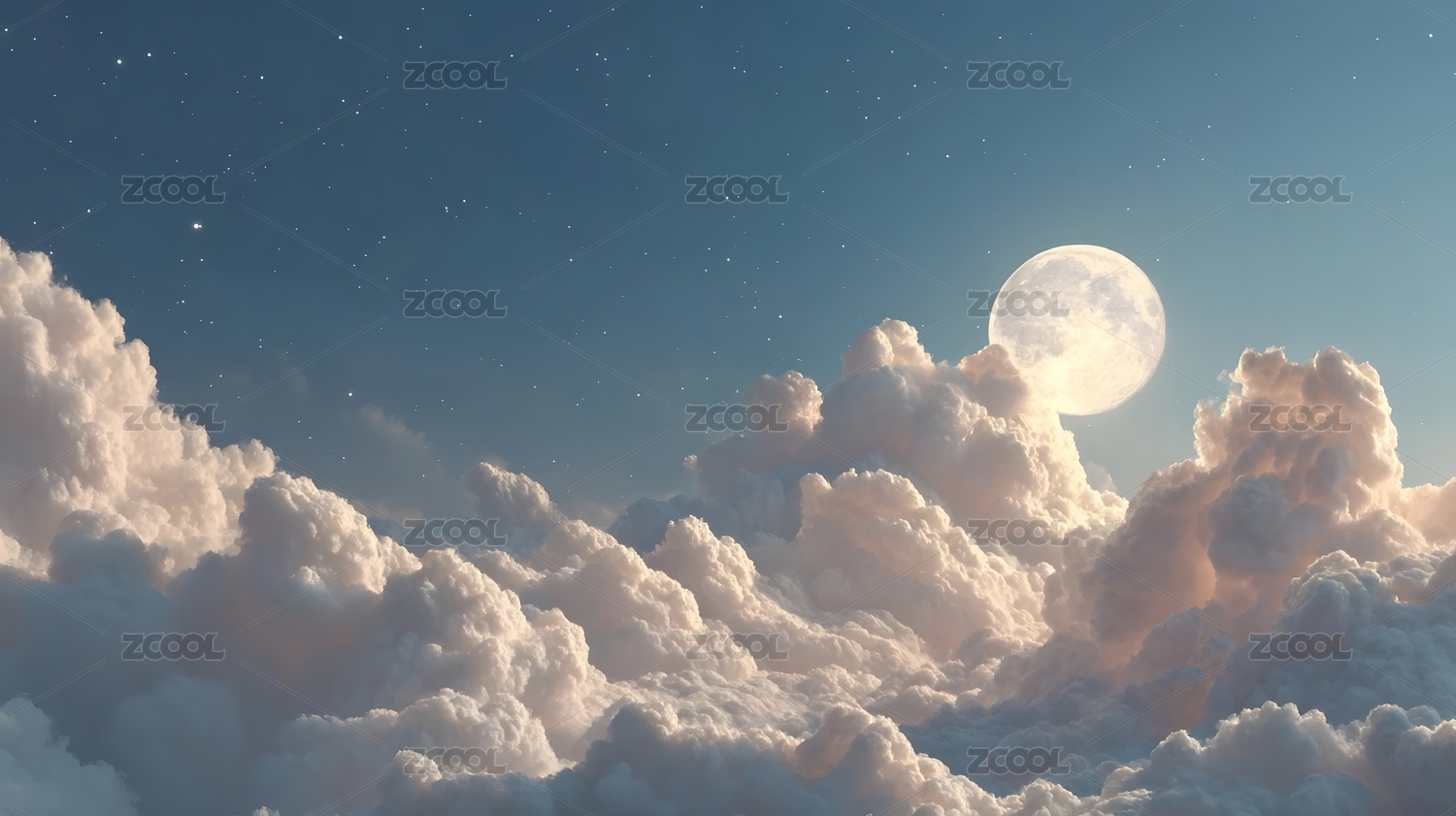 深蓝色夜晚梦幻月亮天空云层,唯美治愈插画