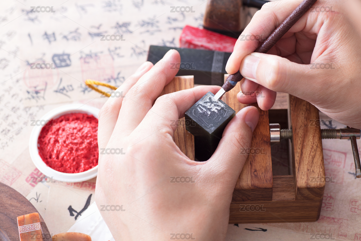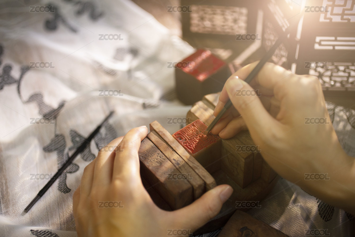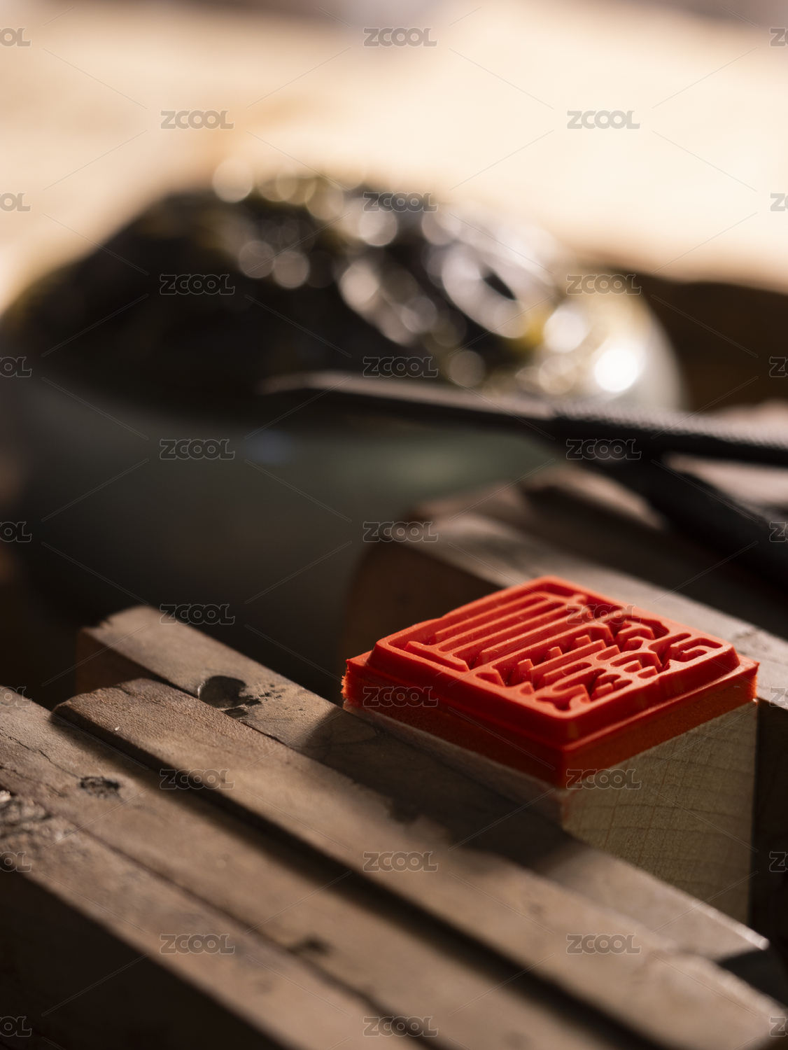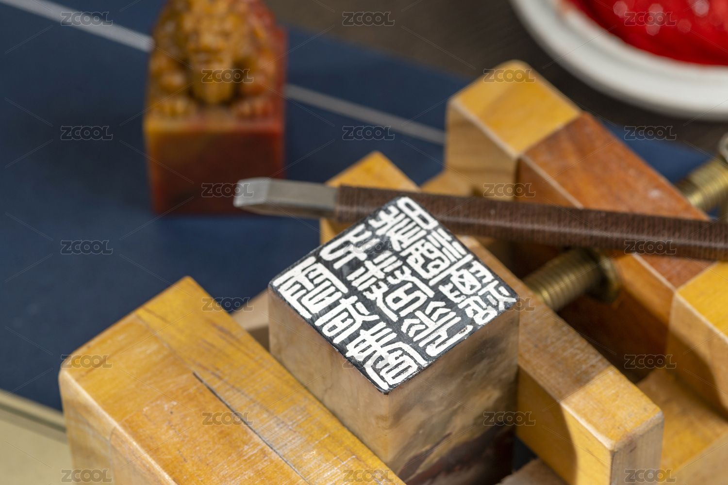 篆刻艺术印章刻刀印谱印泥摆放在桌面上