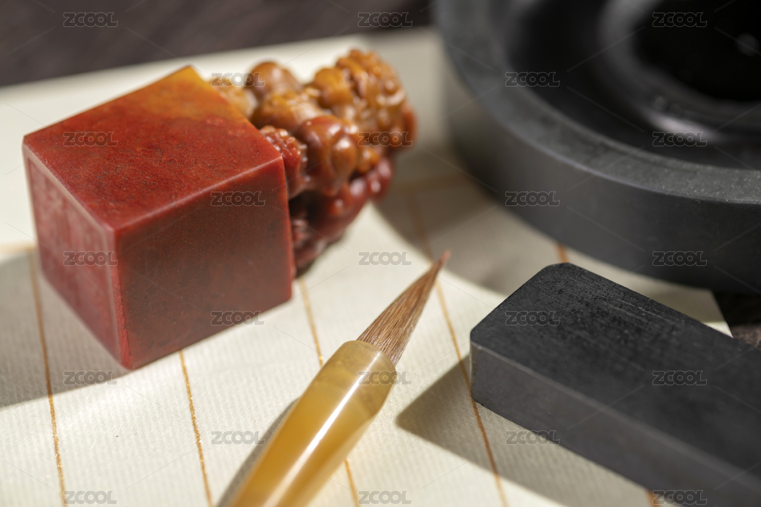 桌面上的毛笔宣纸砚台印章等文房四宝