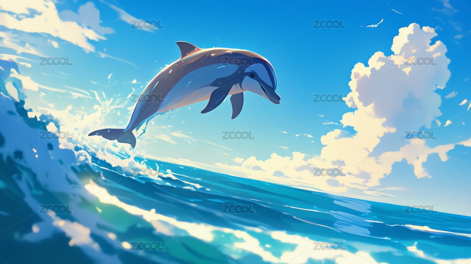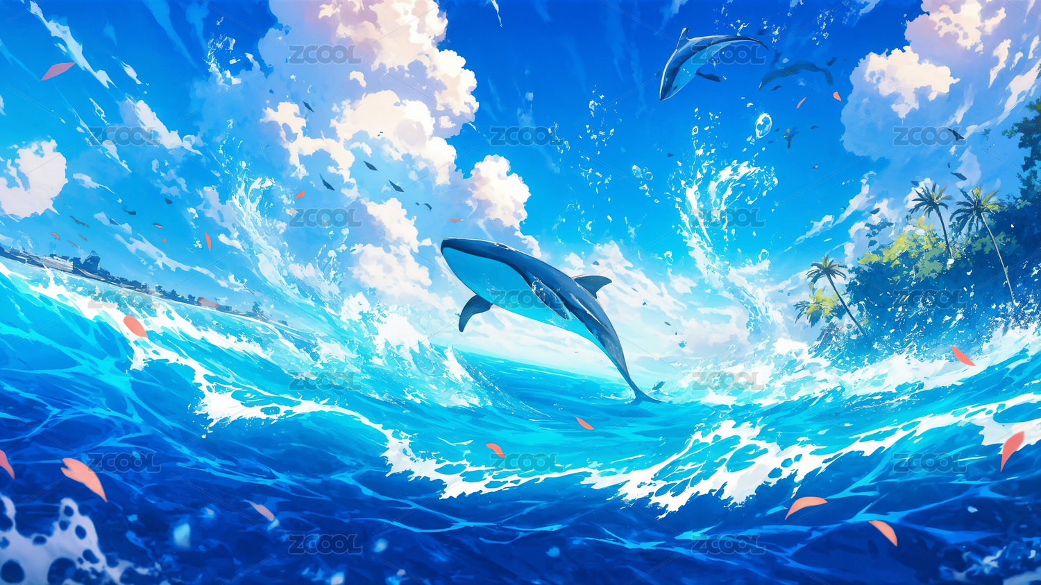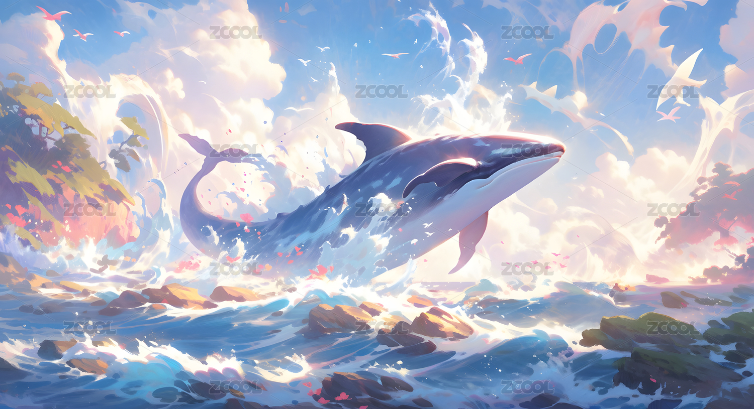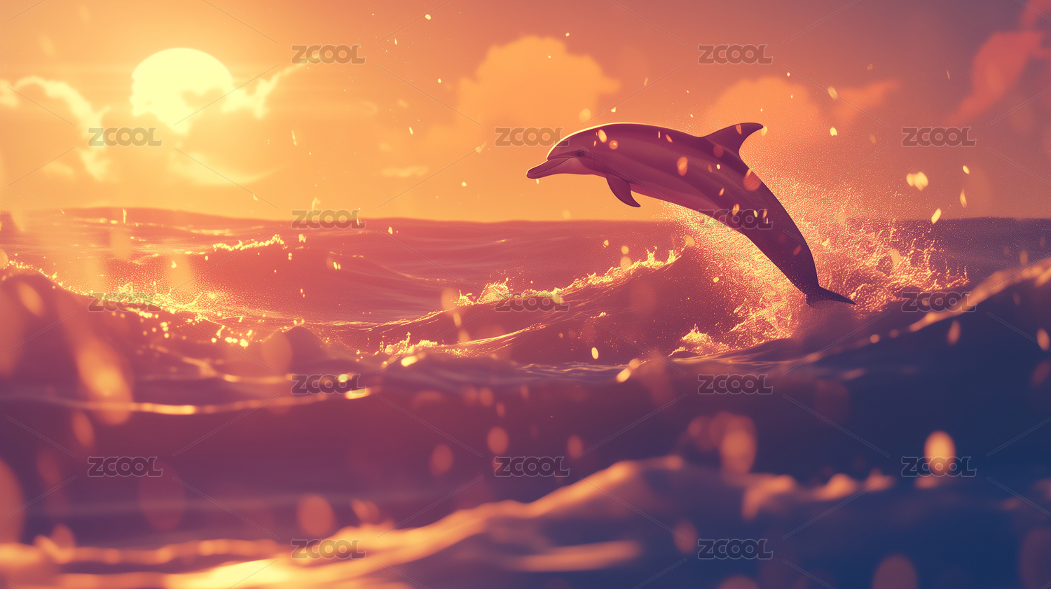 跃出水面的海豚与梦幻天空