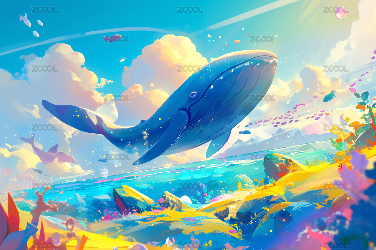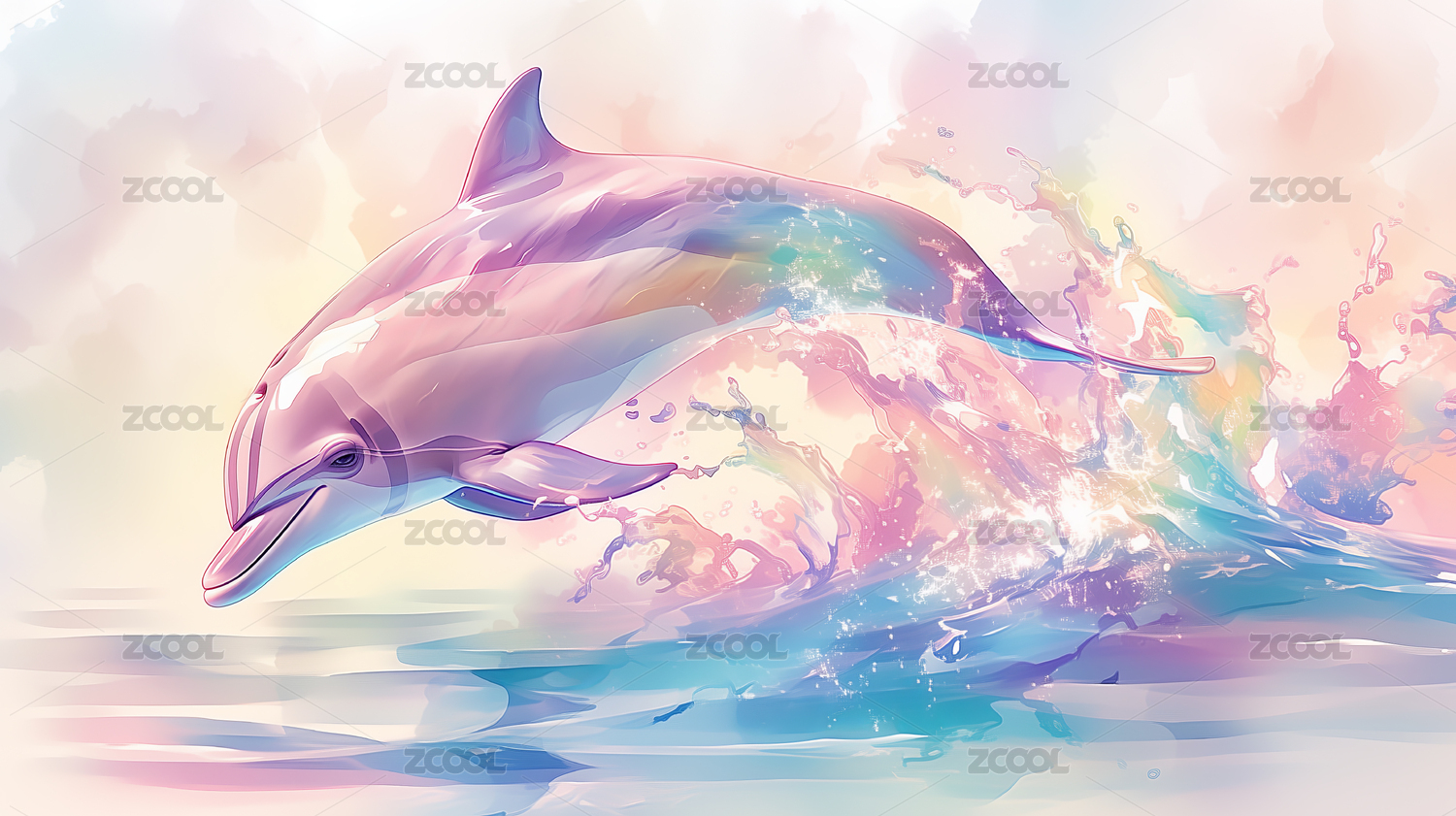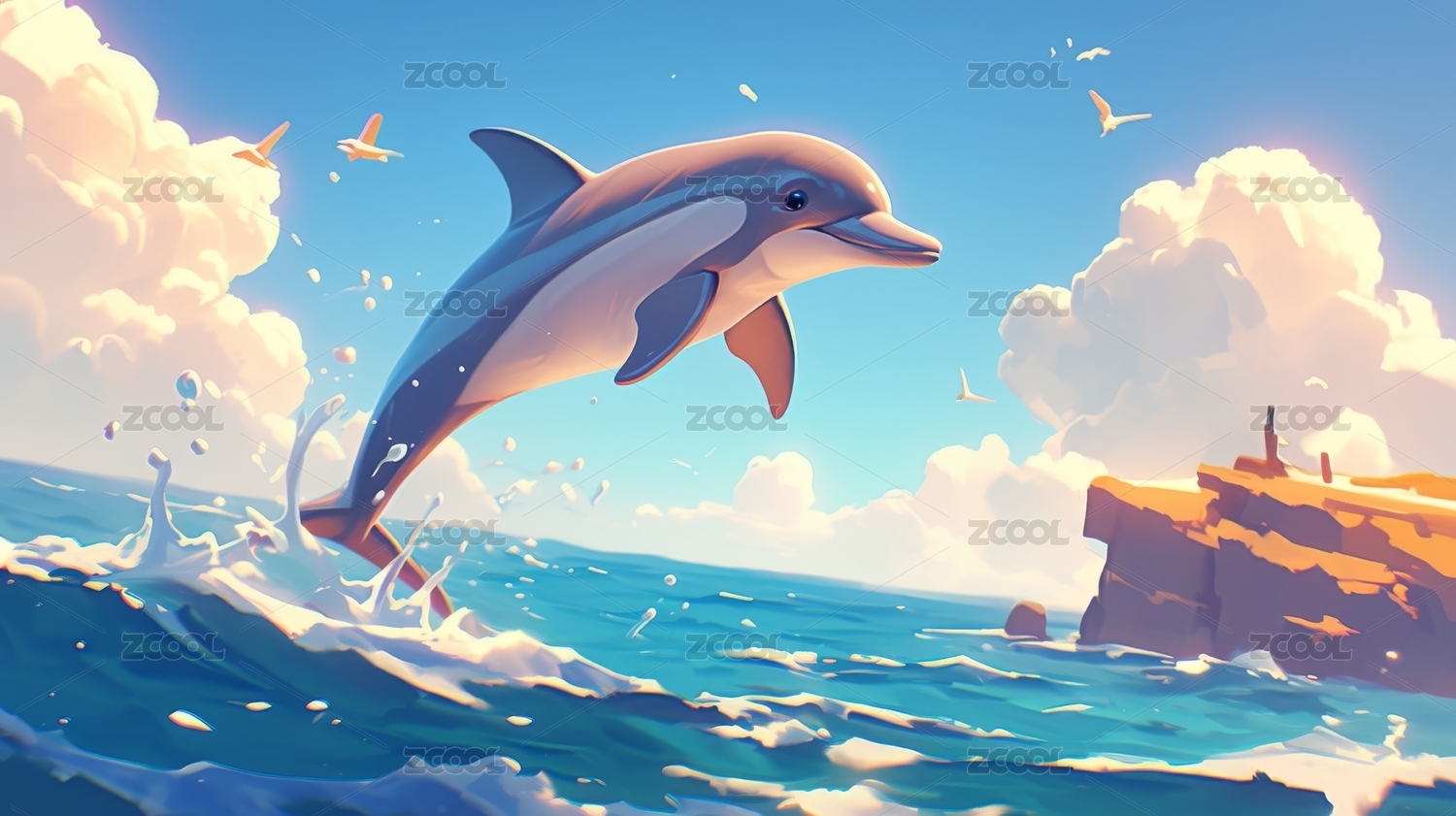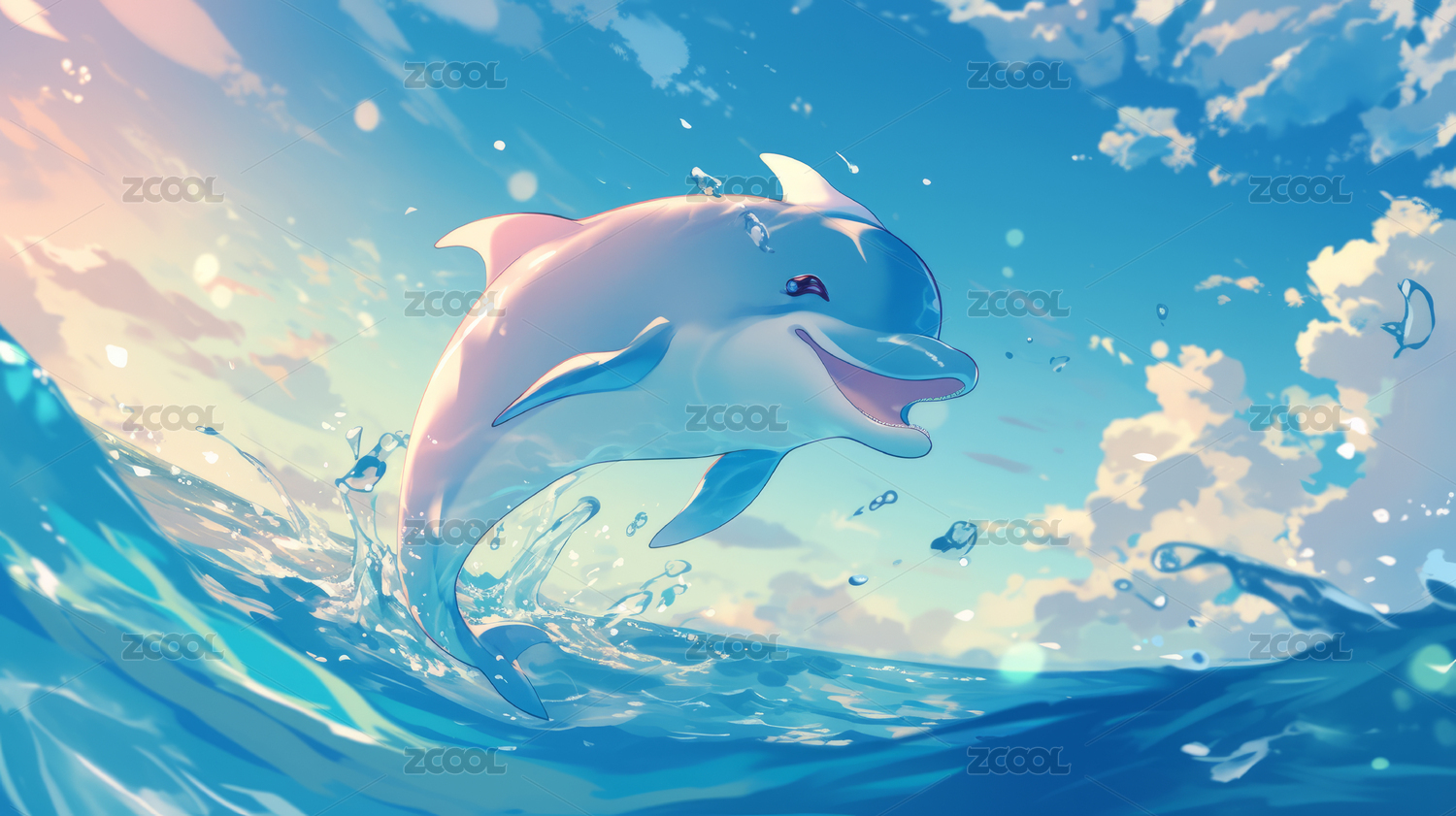 跃出水面的海豚与梦幻天空