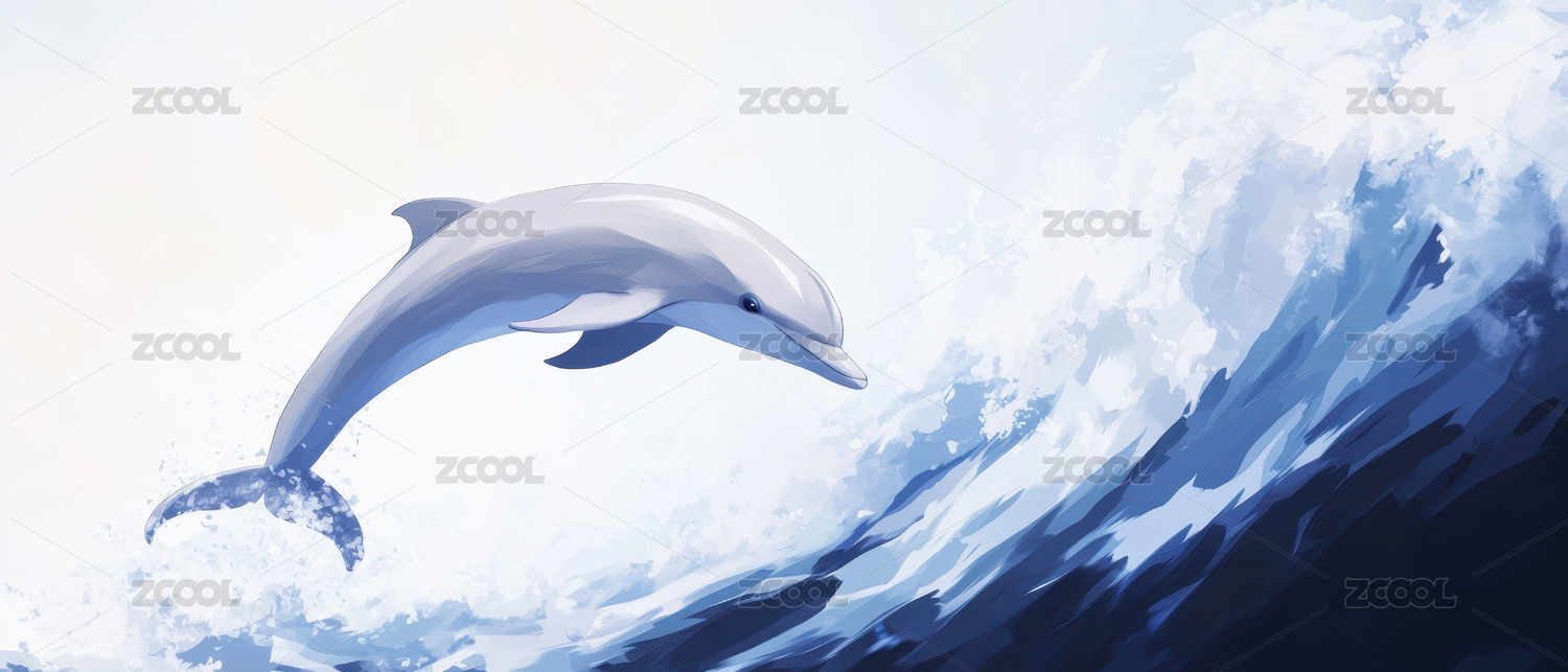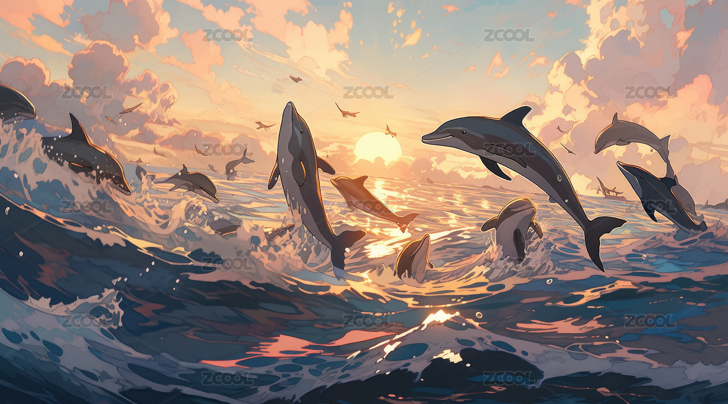 唯美梦幻海豚海面插画