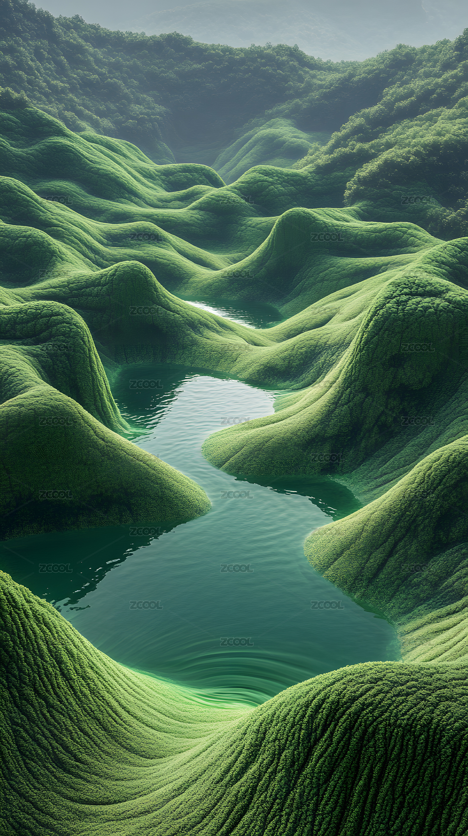 绿色山峦与蜿蜒碧水3D渲染图