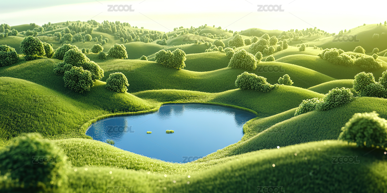 绿色湖泊与连绵山丘的自然风光